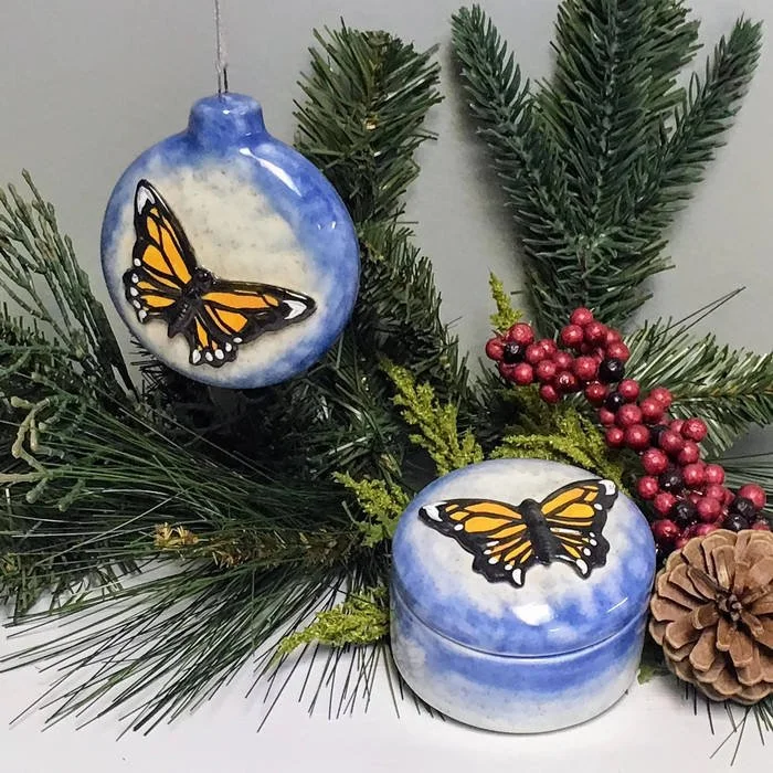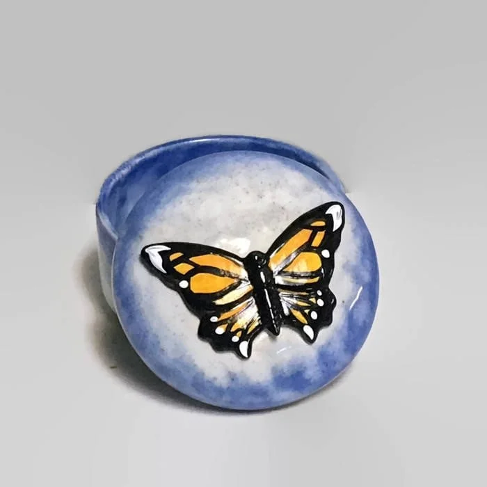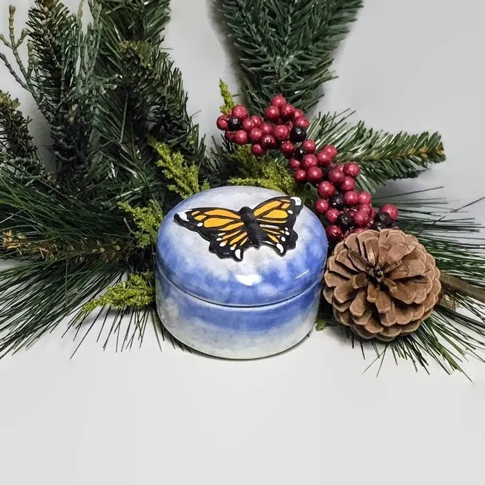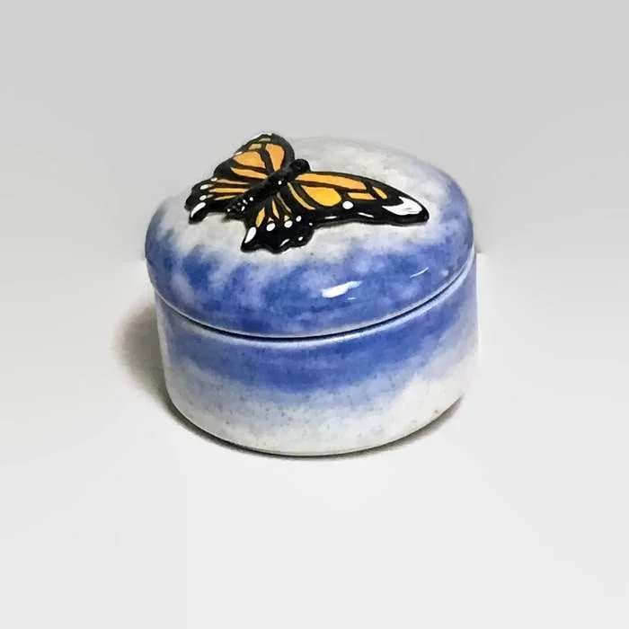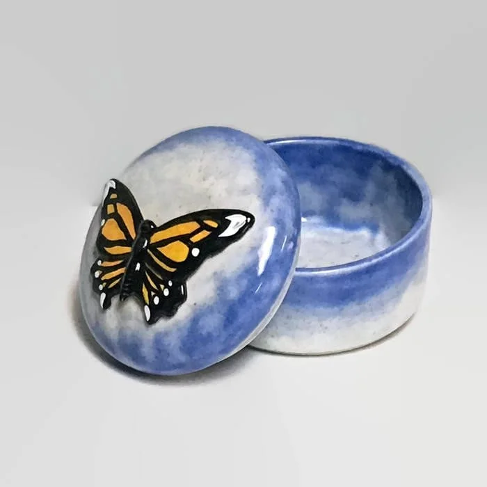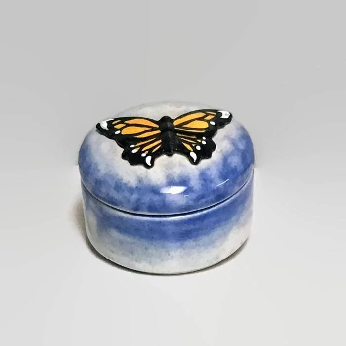 This box: • Measures approximately 3 inches in diameter by 3 inches tall • Features a monarch butterfly • Finished in blue glazes • Is handmade through slip casting processes