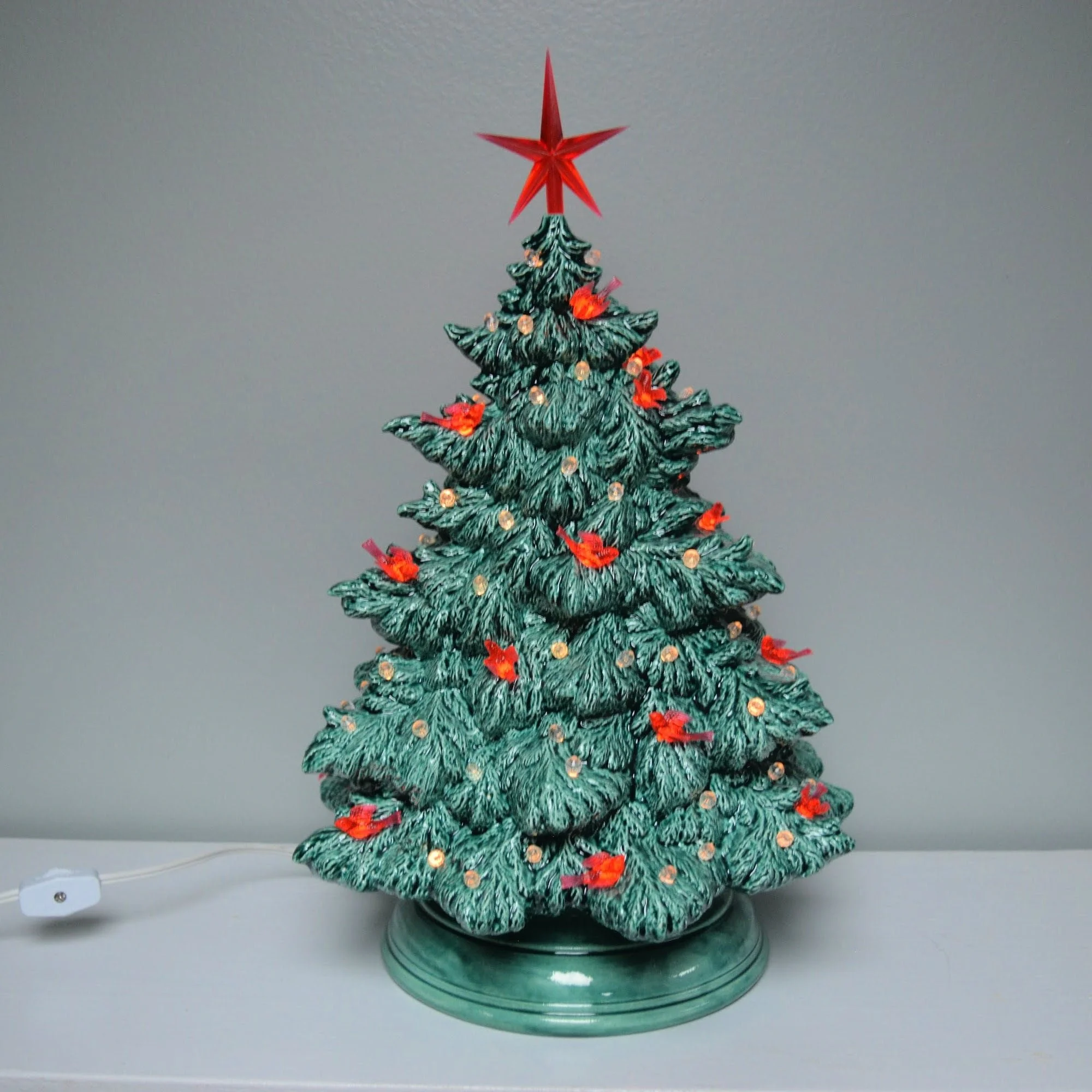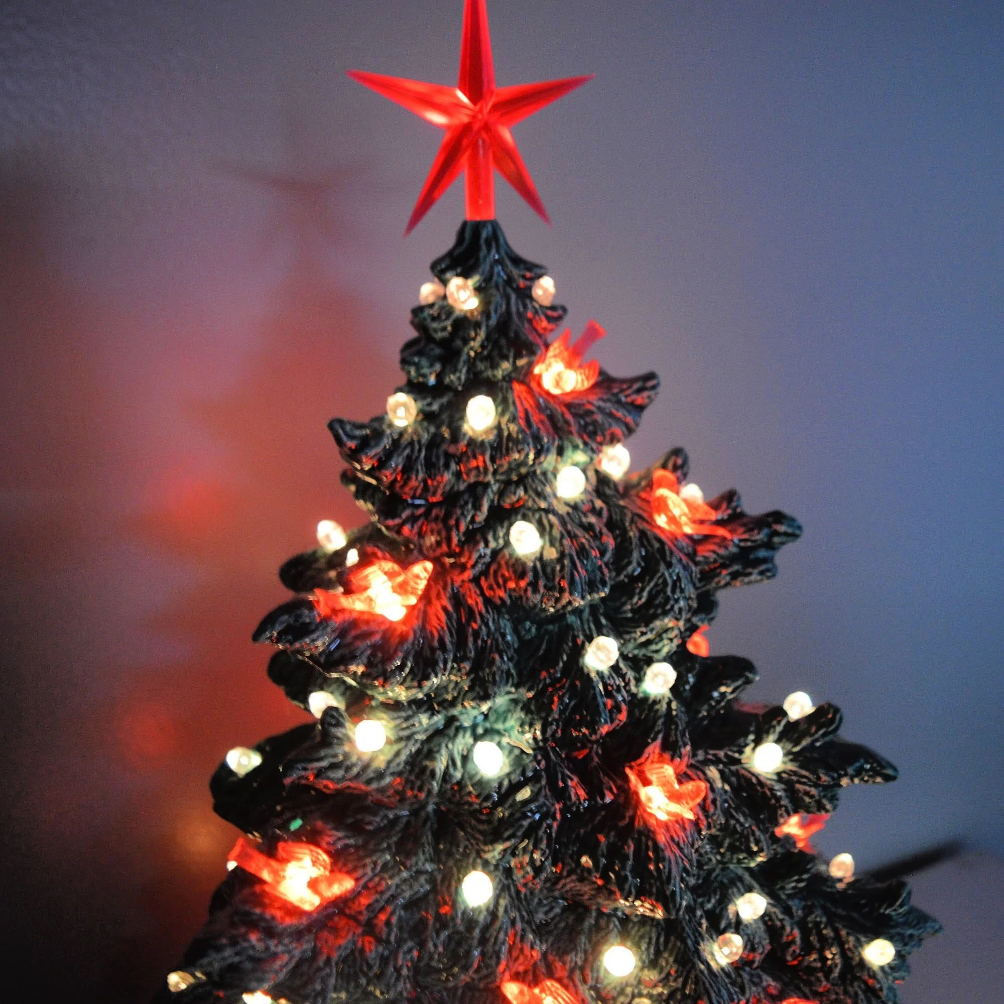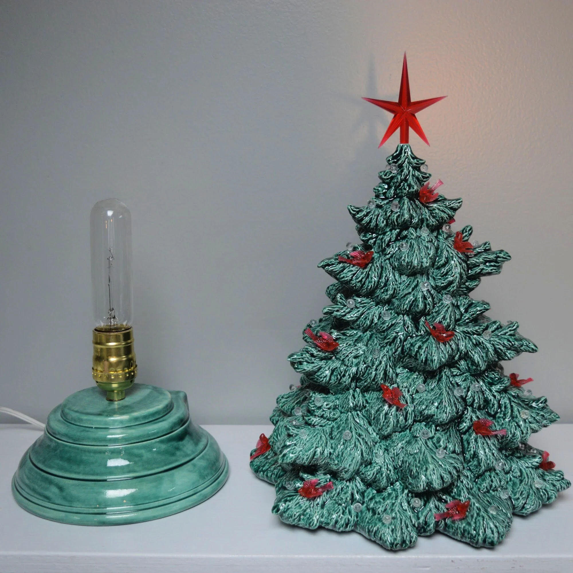 This Ceramic Christmas Tree: • Is 13 inches tall without the star – 15.5 inches with the star • Is glazed in an Evergreen glaze • Features Red Dove Lights, and White Pin Lights that have been glued in place. • Is fully wired, just screw in the light bulb, place the tree on the base, plug-in and you are ready to enjoy your tree. • Includes a large red modern star • Made in the USA • Will be shipped packaged in bubble wrap and packing peanuts and insured to ensure safe delivery.