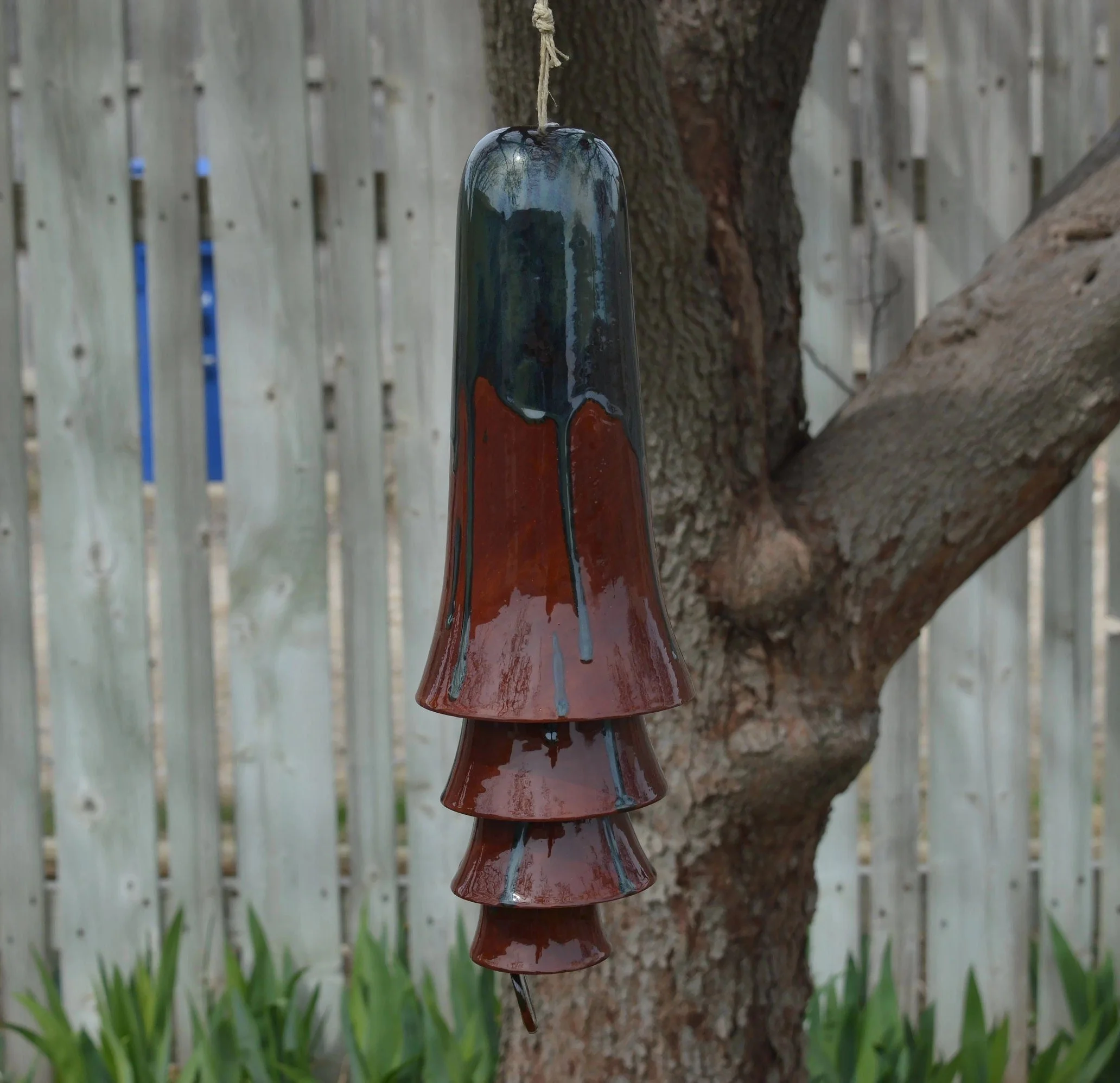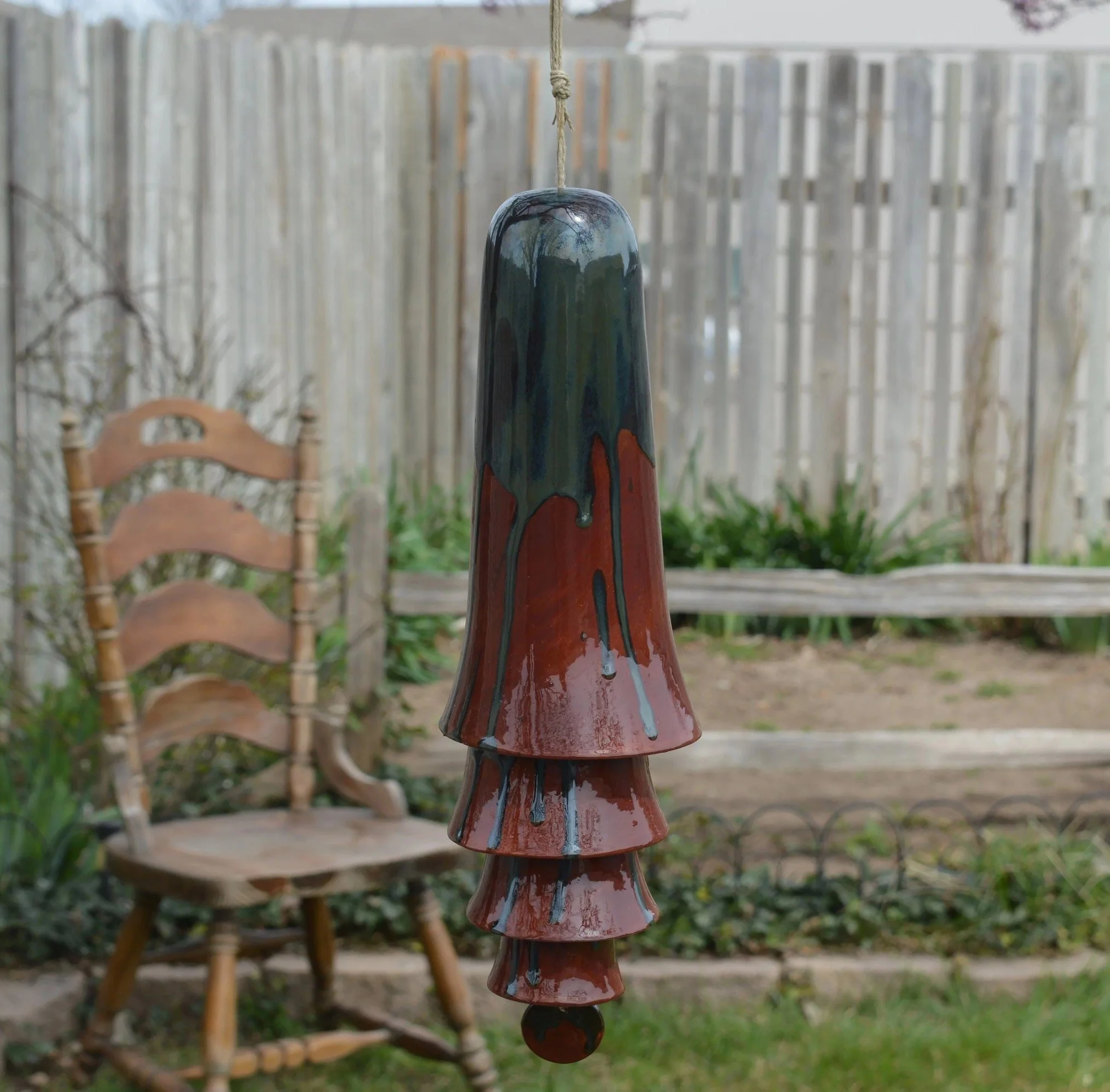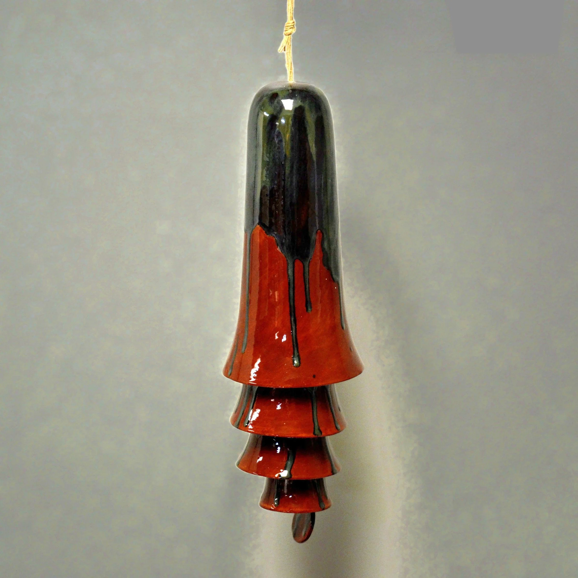 • Each set of cone bells is handmade and hand glazed. Bells may be similar but never exactly the same when purchasing more than one. • The bells hang approximately 20" long • The largest cone bell is approximately 4.5" in diameter and 9.5” tall. • The bells weigh approximately 2 pounds. • Bells are suspended on multiple strands of jute • Wind chime is Made in the USA with 98% of materials/equipment sourced in the USA • The tones are never exactly alike from any two sets of bells • Color palette: Ox Blood Red with a splash of greens, greys and blues