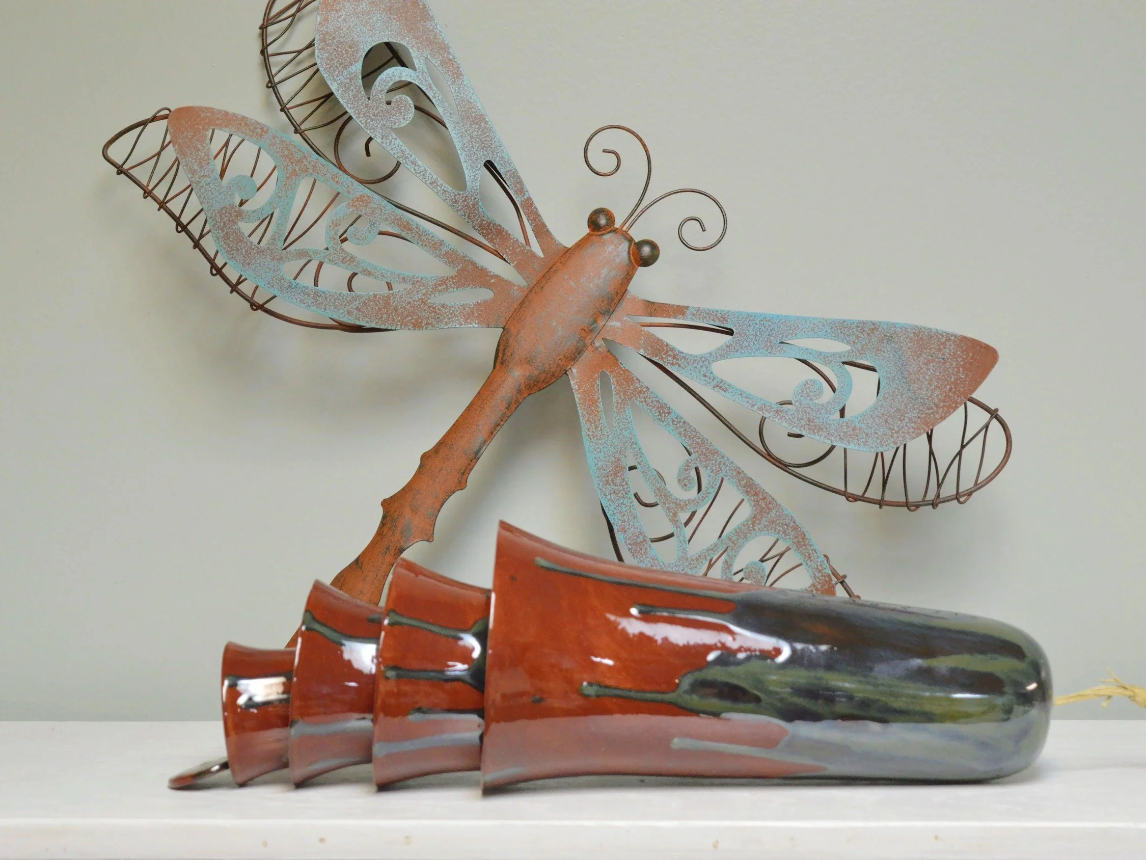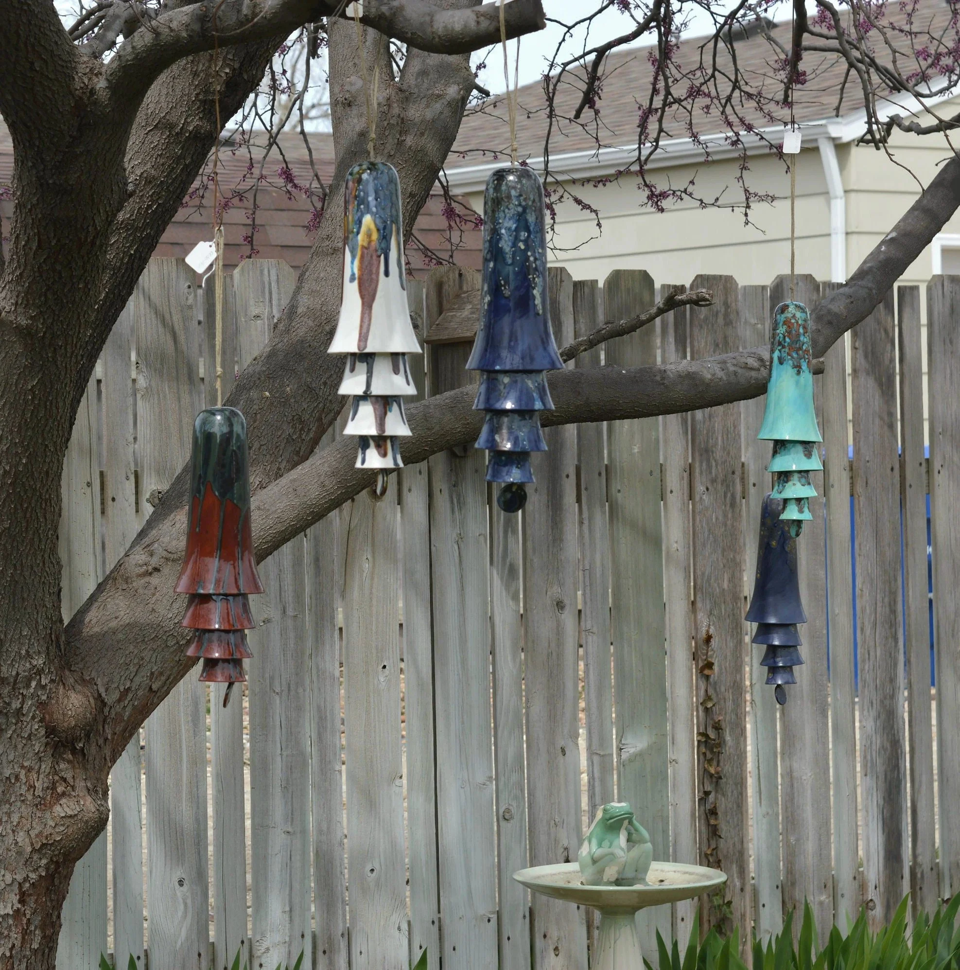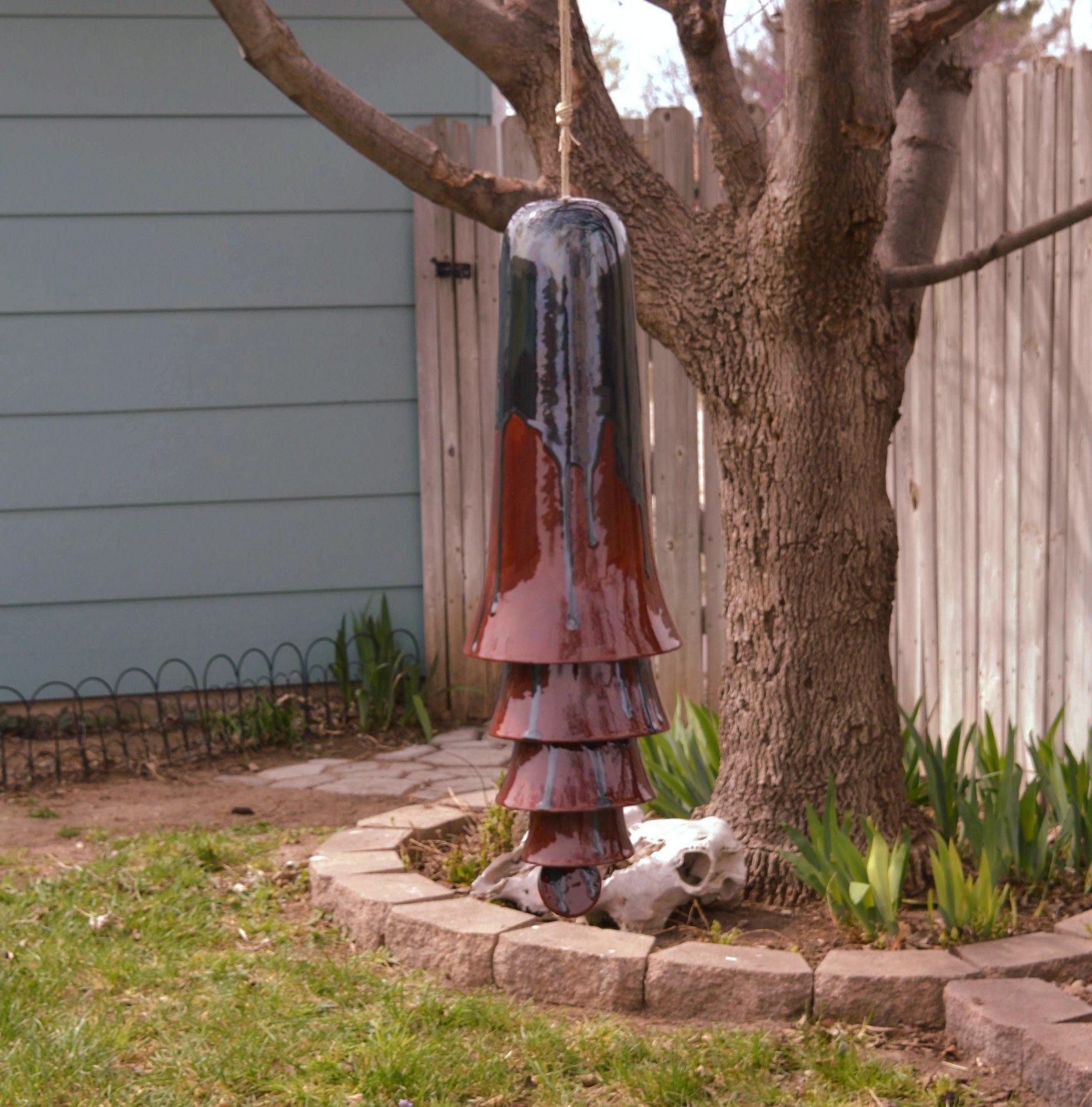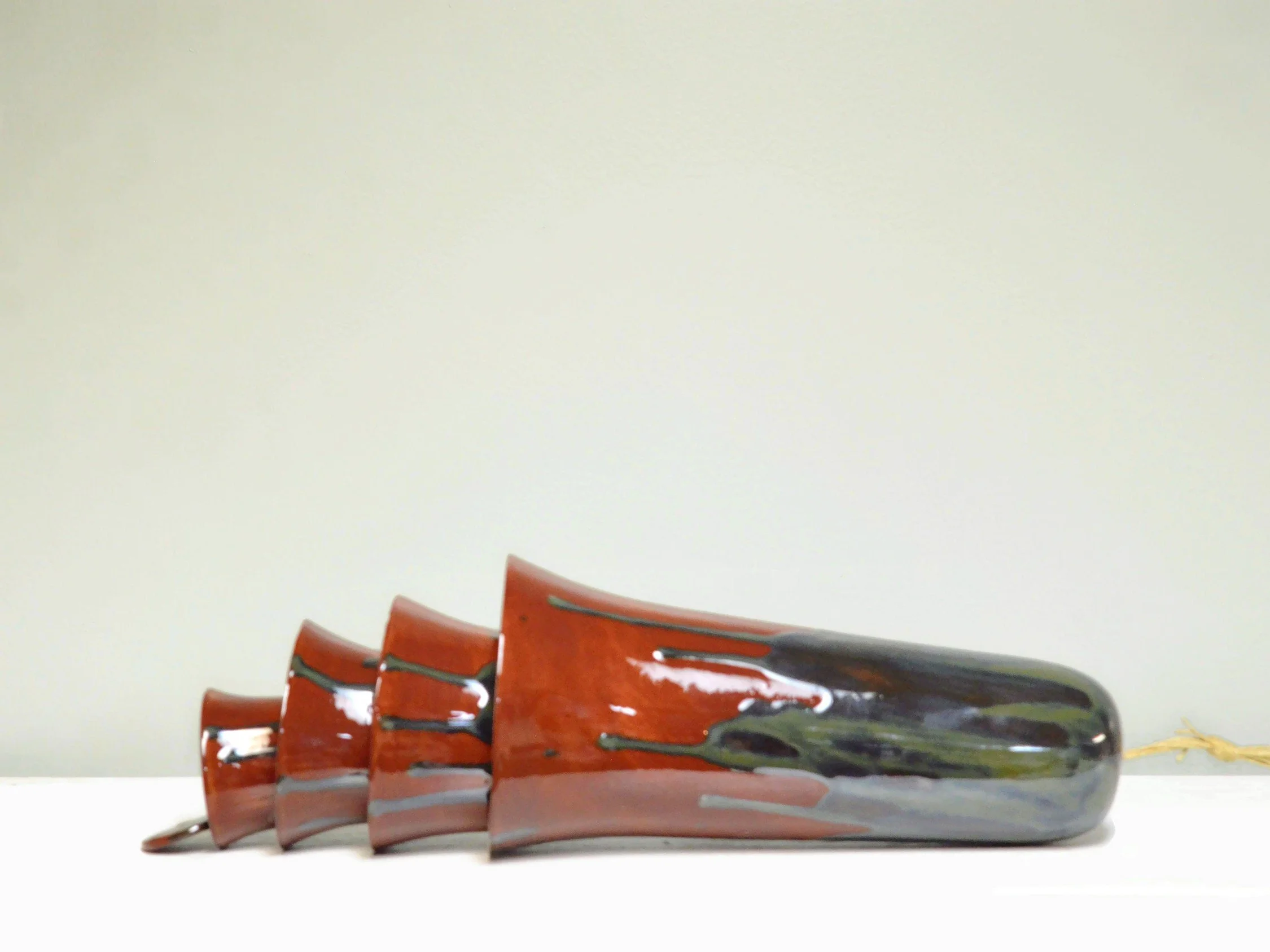 • Each set of cone bells is handmade and hand glazed. Bells may be similar but never exactly the same when purchasing more than one. • The bells hang approximately 20" long • The largest cone bell is approximately 4.5" in diameter and 9.5” tall. • The bells weigh approximately 2 pounds. • Bells are suspended on multiple strands of jute • Wind chime is Made in the USA with 98% of materials/equipment sourced in the USA • The tones are never exactly alike from any two sets of bells • Color palette: Ox Blood Red with a splash of greens, greys and blues