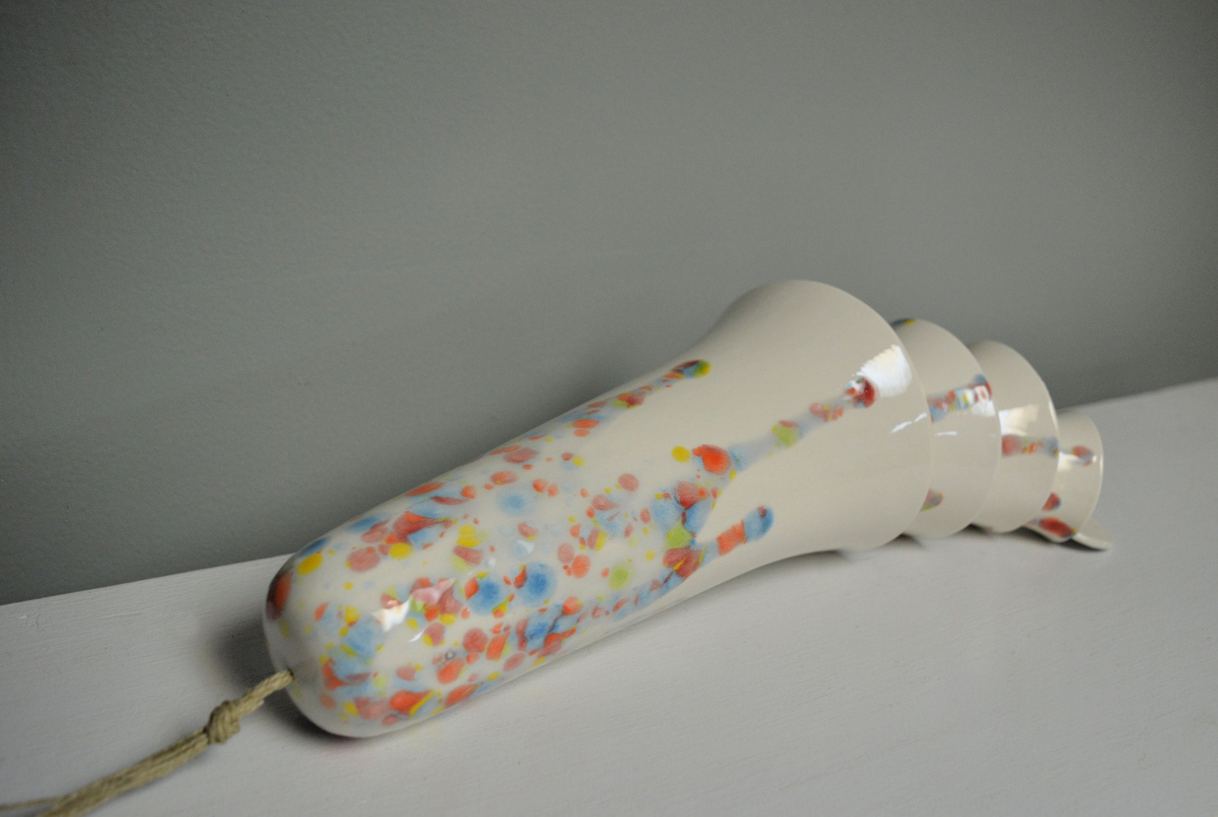 • Each set of cone bells is handmade and hand glazed. Bells may be similar but never exactly the same when purchasing more than one. • The bells hang approximately 20" long • The largest cone bell is approximately 4.5" in diameter and 9.5” tall. • The bells weigh approximately 2 pounds. • Bells are suspended on multiple strands of jute • Wind chime is Made in the USA with 98% of materials/equipment sourced in the USA • The tones are never exactly alike from any two sets of bells • Color palette: white base with shades of red, yellow and blue