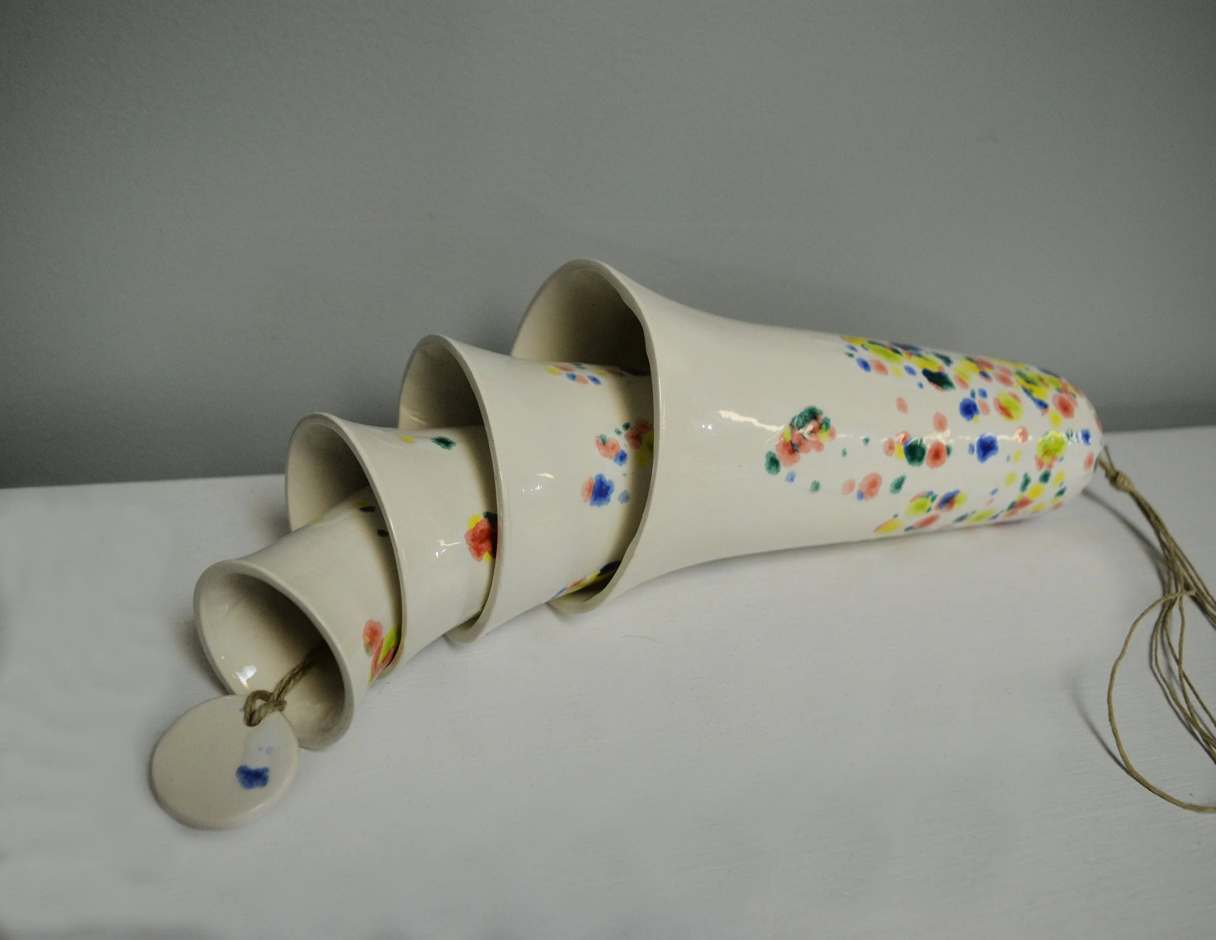 • Each set of cone bells is handmade and hand glazed. Bells may be similar but never exactly the same when purchasing more than one. • The bells hang approximately 20" long • The largest cone bell is approximately 4.5" in diameter and 9.5” tall. • The bells weigh approximately 2 pounds. • Bells are suspended on multiple strands of jute • The tones are never exactly alike from any two sets of bells • Wind chime is Made in the USA with 98% of materials/equipment sourced in the USA • Color palette: white base with shades of red, yellow, blue, and green