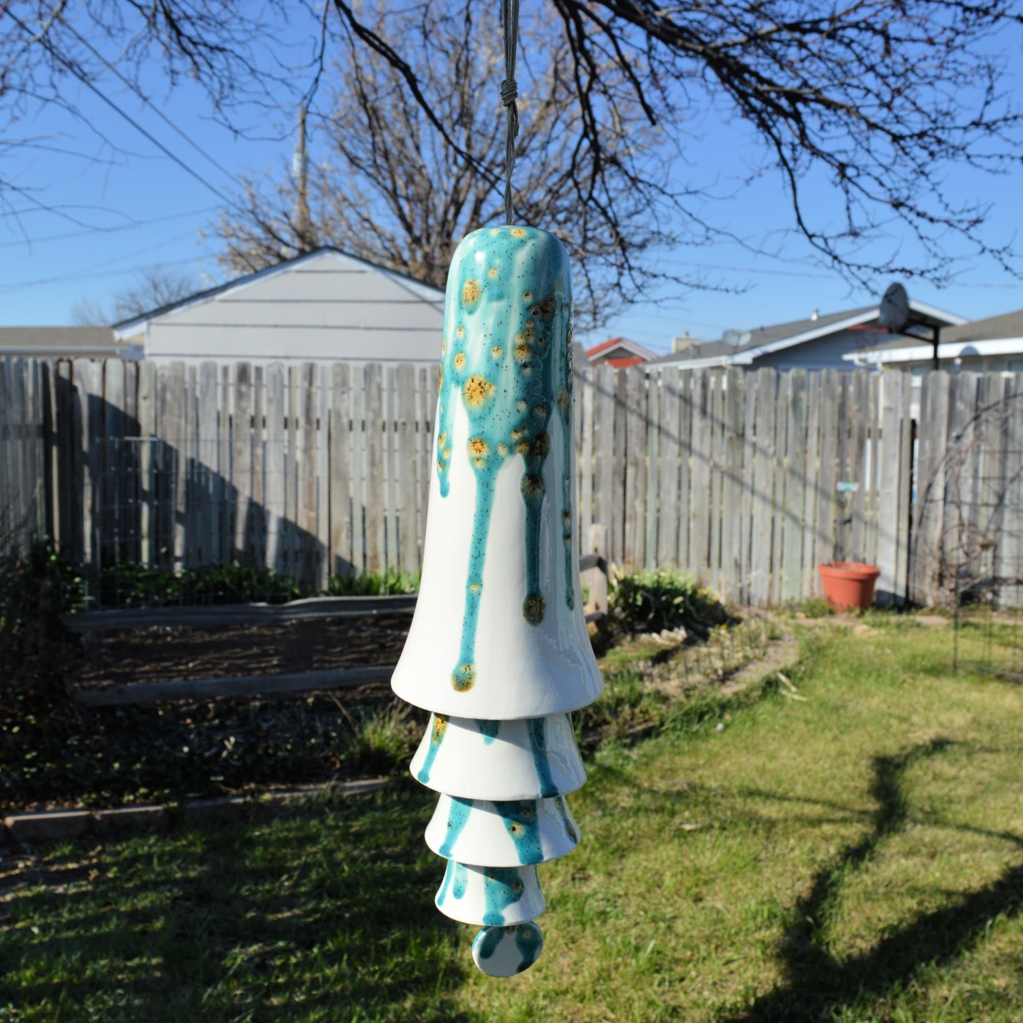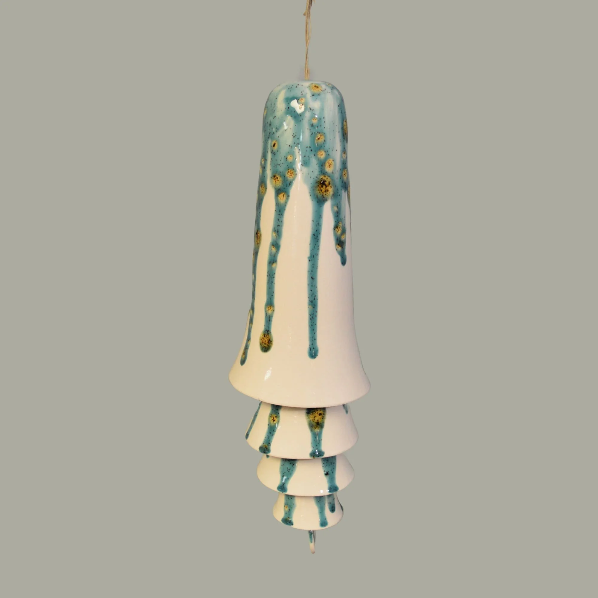 • Each set of cone bells is handmade and hand glazed. Bells may be similar but never exactly the same when purchasing more than one. • The bells hang approximately 20" long • The largest cone bell is approximately 4.5" in diameter and 9.5” tall. • The bells weigh approximately 2 pounds. • Bells are suspended on multiple strands of jute • Wind chime is Made in the USA with 98% of materials/equipment sourced in the USA • The tones are never exactly alike from any two sets of bells • Color palette: white base with teal and golden beige