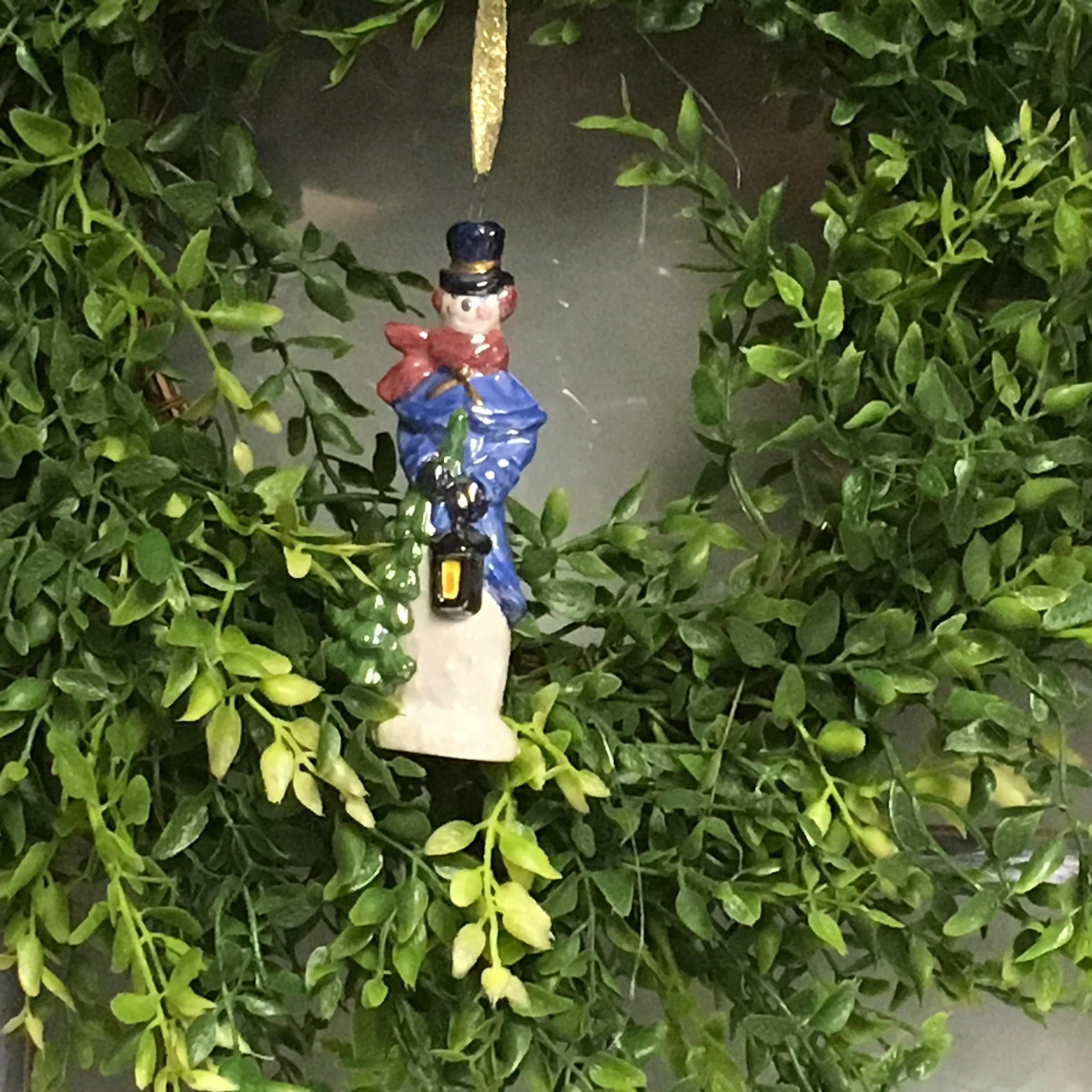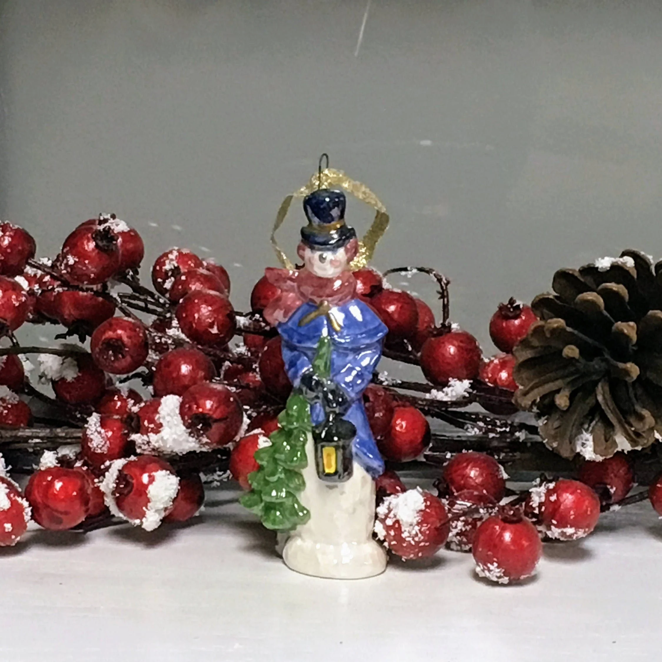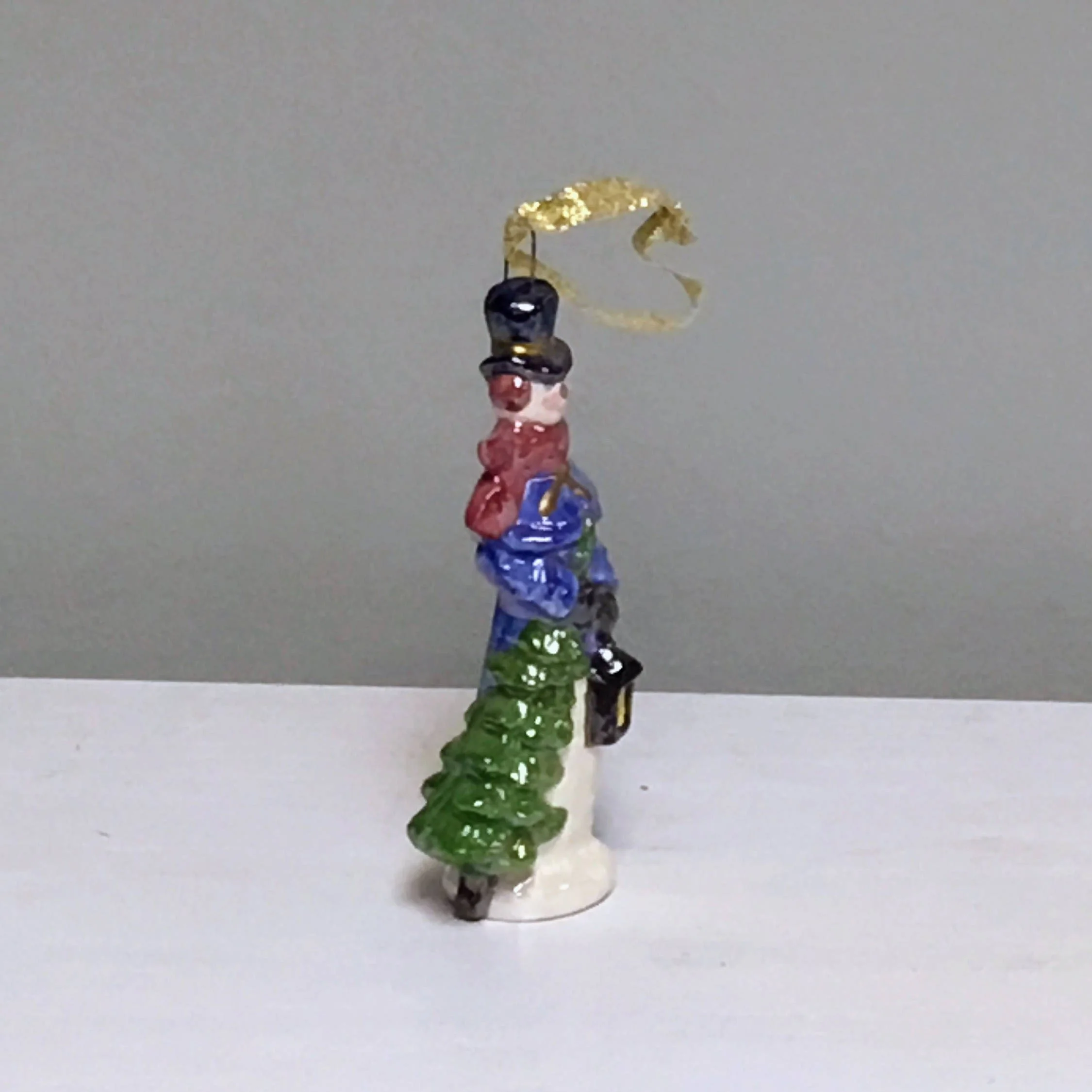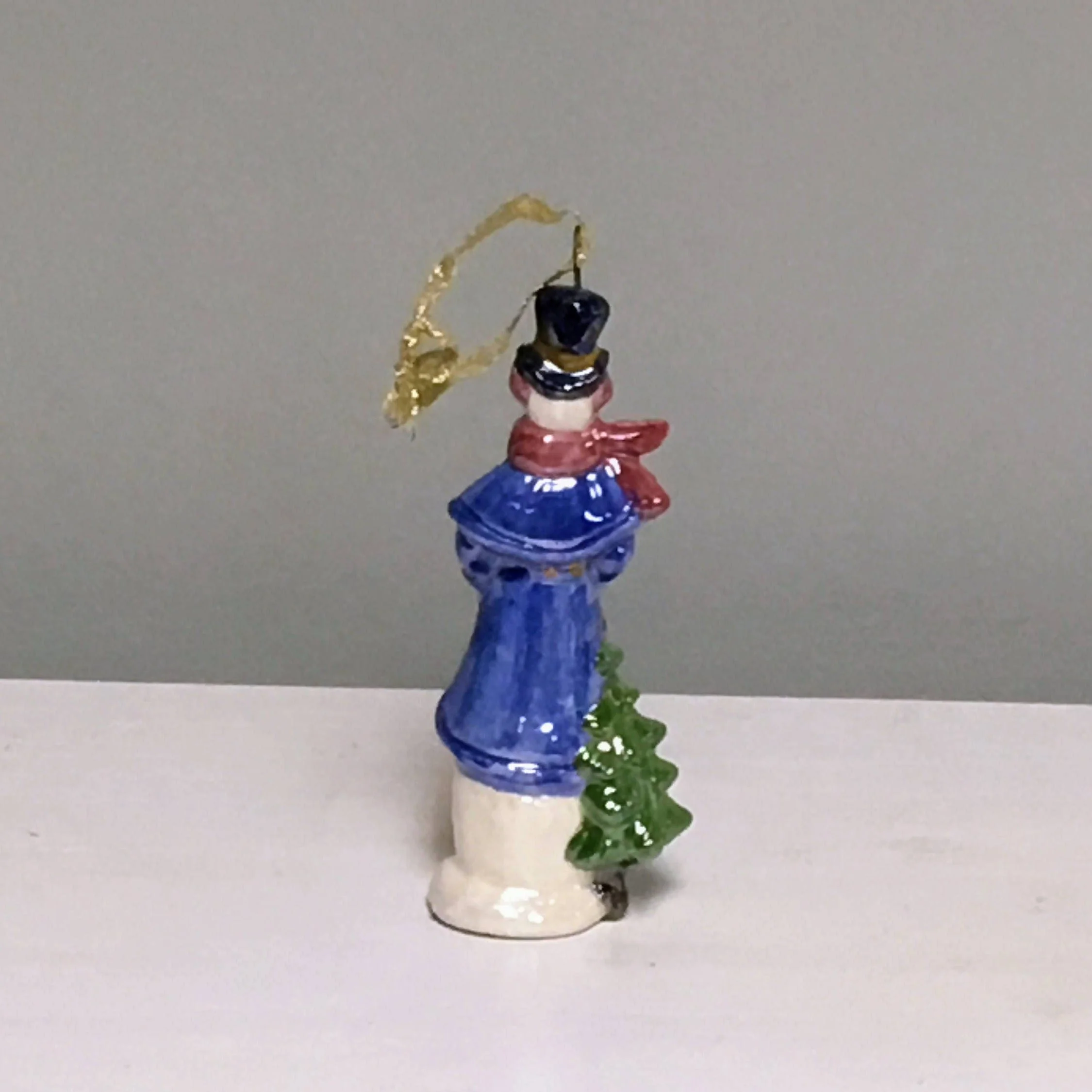 This dapper ceramic snowman Christmas ornament can't wait to be on your tree. He's a handsome guy bringing home his Christmas tree while holding a lantern, wearing a black top hat, rose scarf and blue coat.