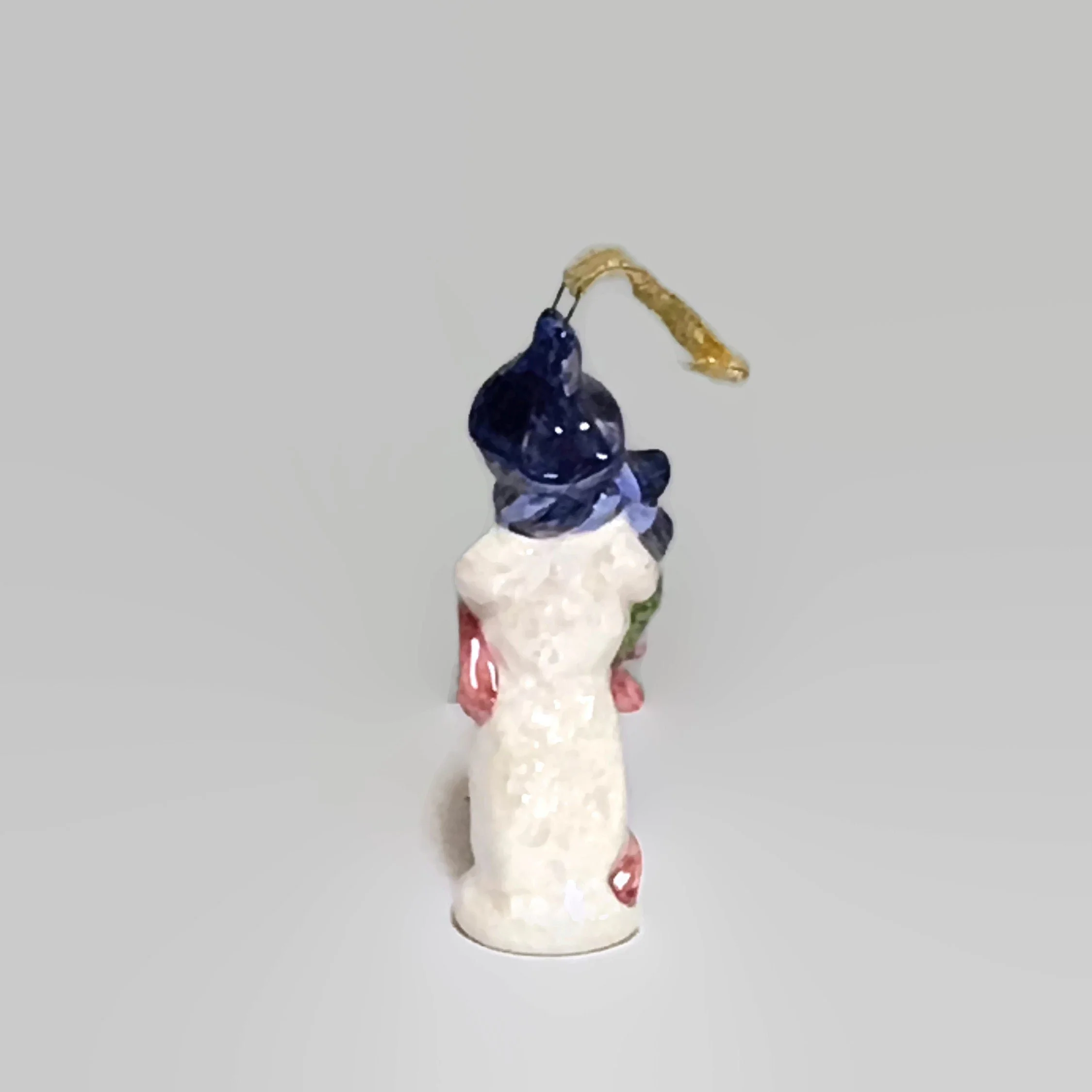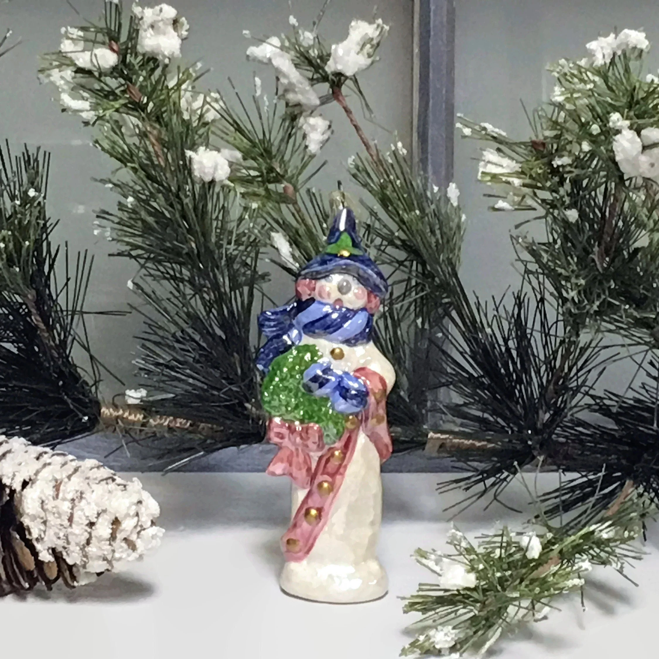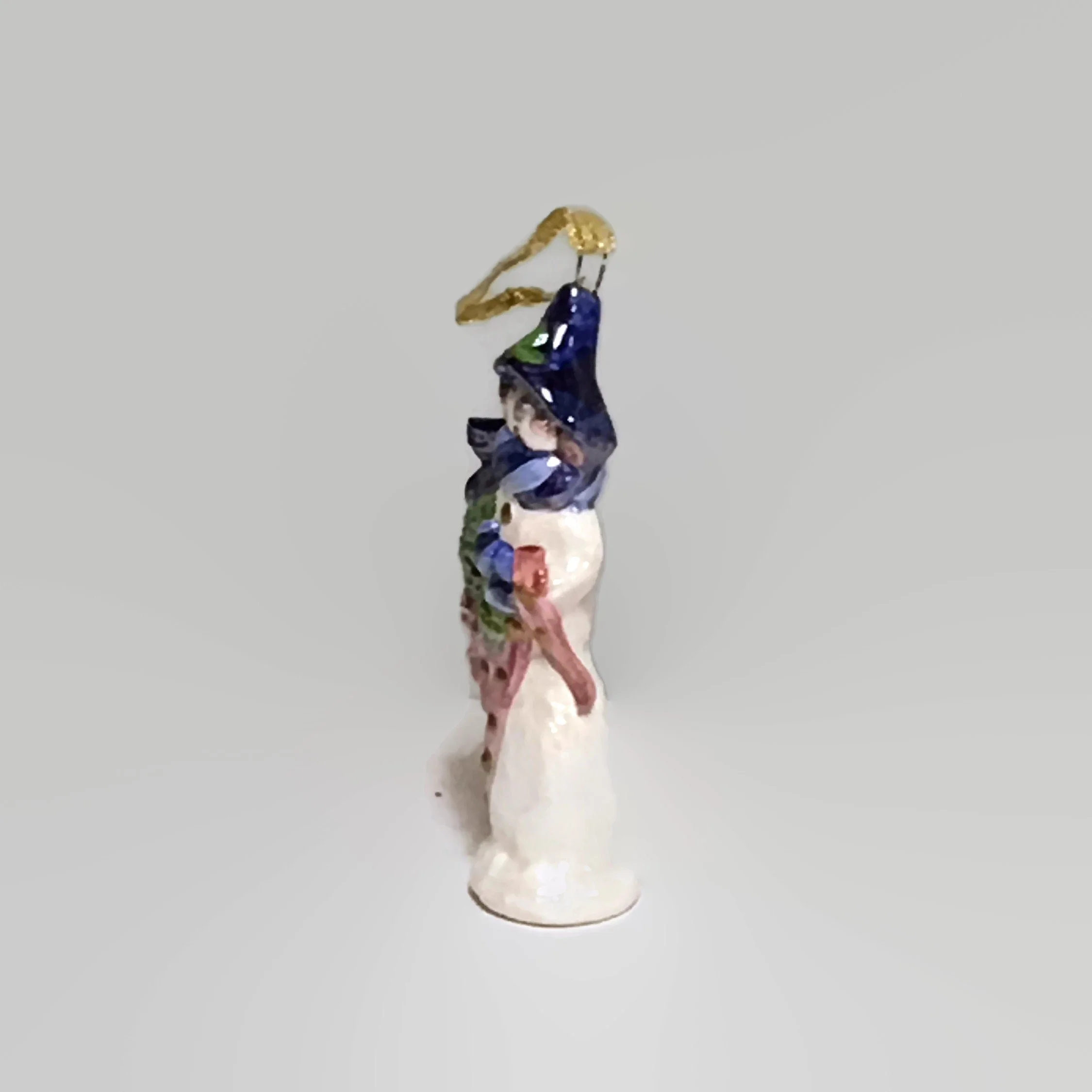 This ornament: • Measures approximately 4.25 inches tall • Has a gold ribbon that provides a 2-3 inch drop • Includes the colors of: rose, light blue, holly green, white and buttons with gold leaf • Coordinates with two other Oakknob Snowmen • Finished in underglaze, glaze and mother of pearl overglaze