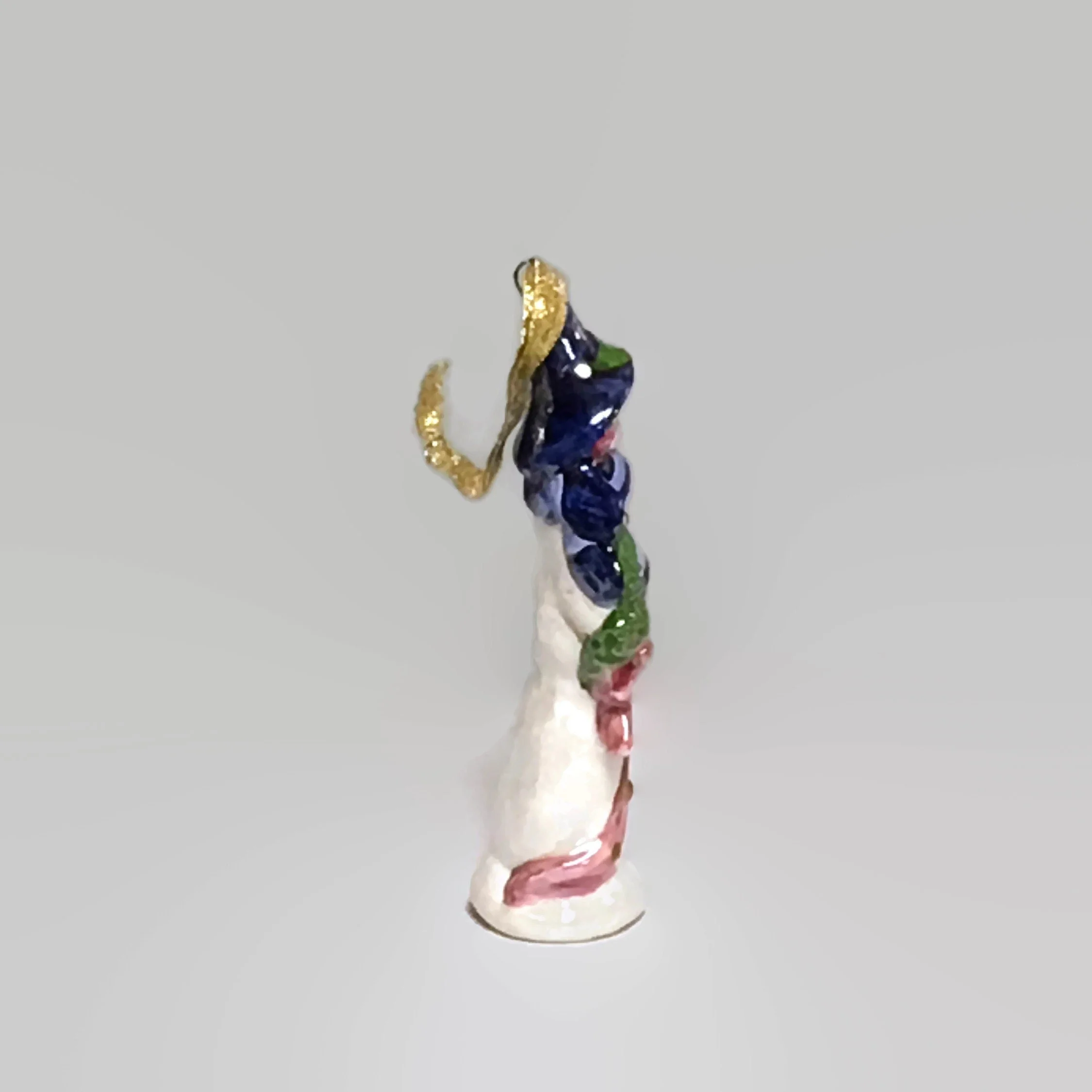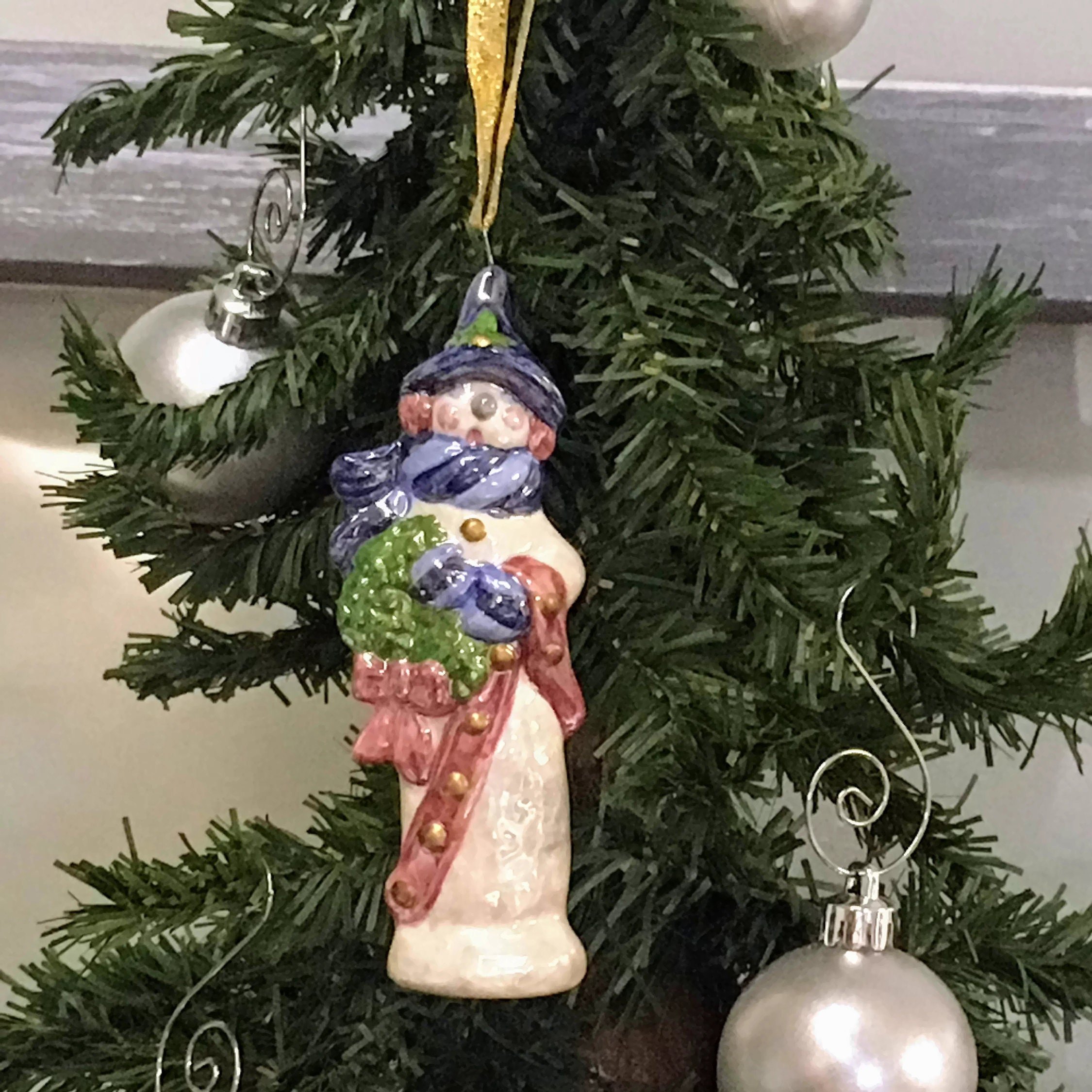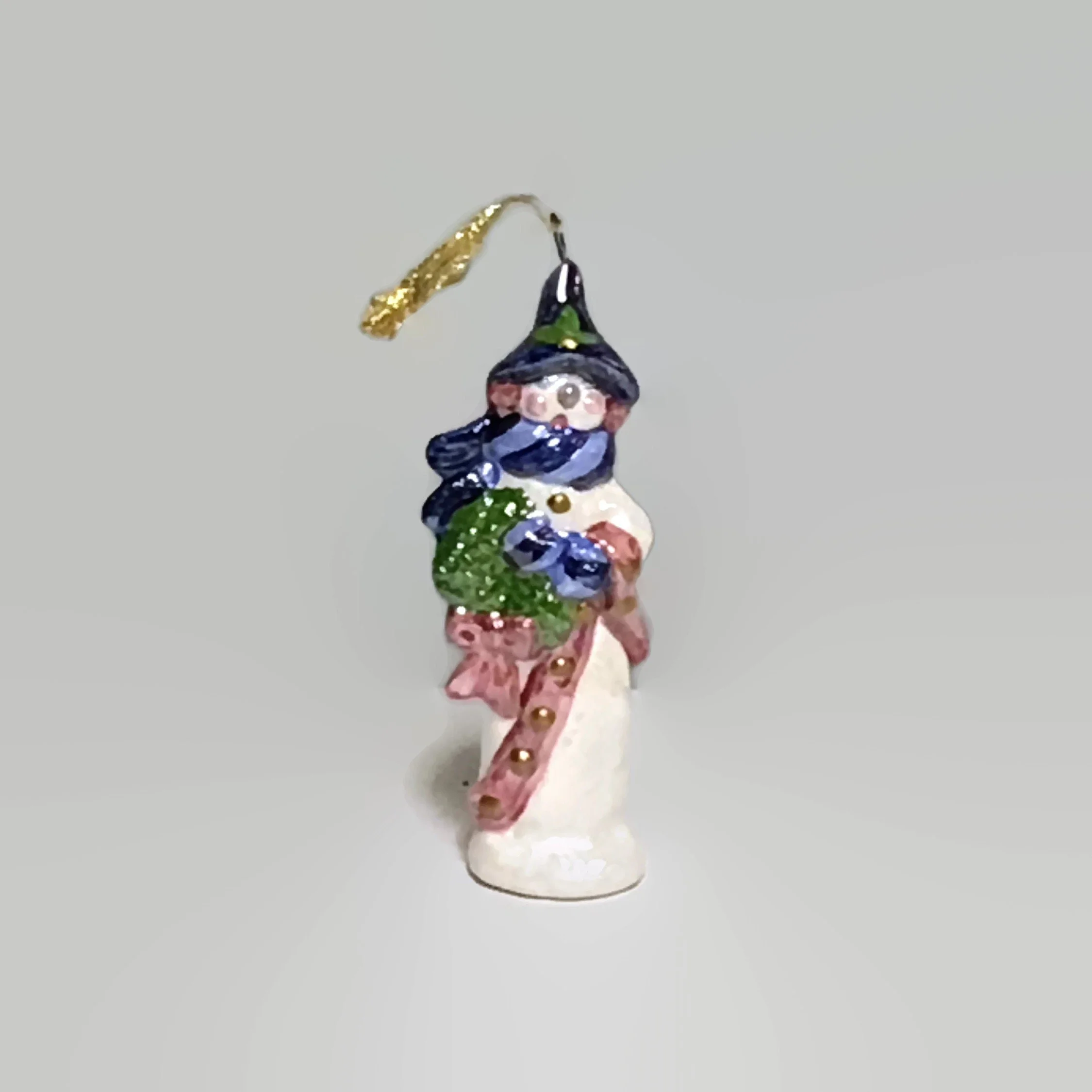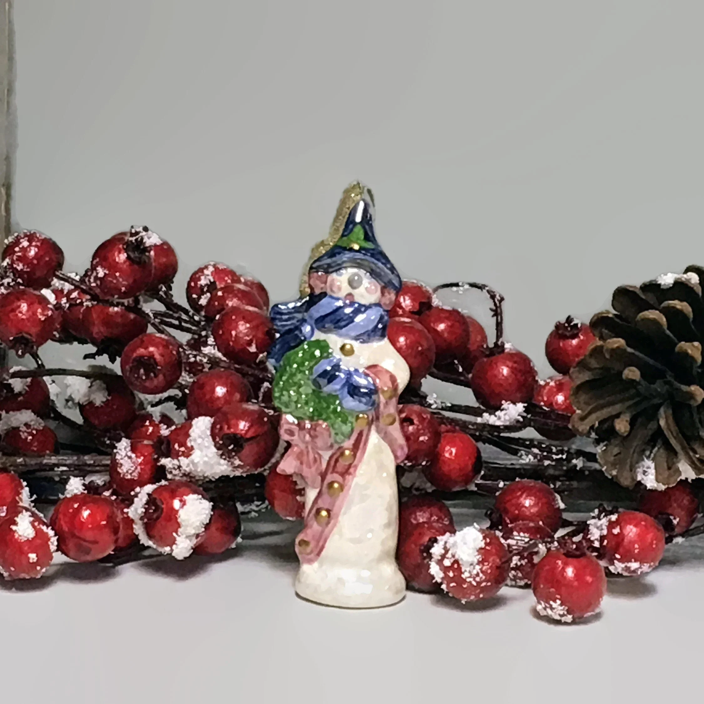 This sweet ceramic snowman Christmas ornament is ready to grace your tree. She's a darling with a wreath, blue floppy hat, blue striped scarf and ribbon of jingle bells.