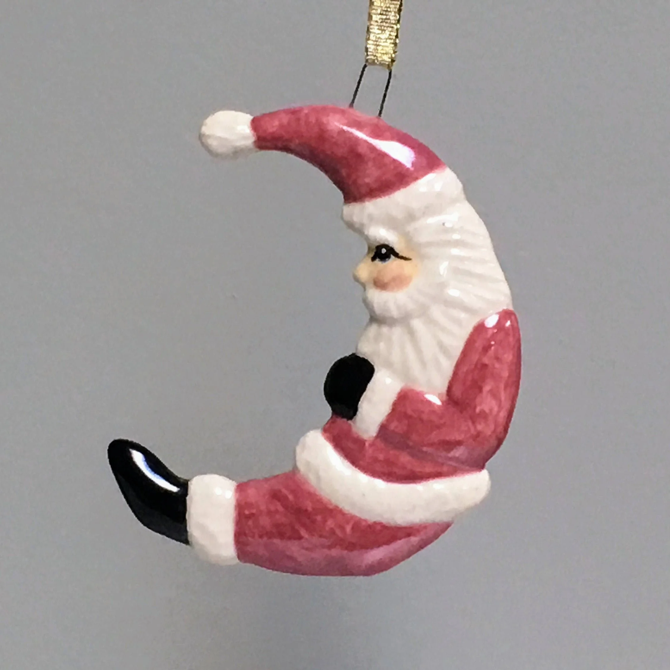 This resting Santa crescent moon ceramic Christmas ornament is dressed in a Victorian Rose suit while taking a well deserved break after his annual travels.