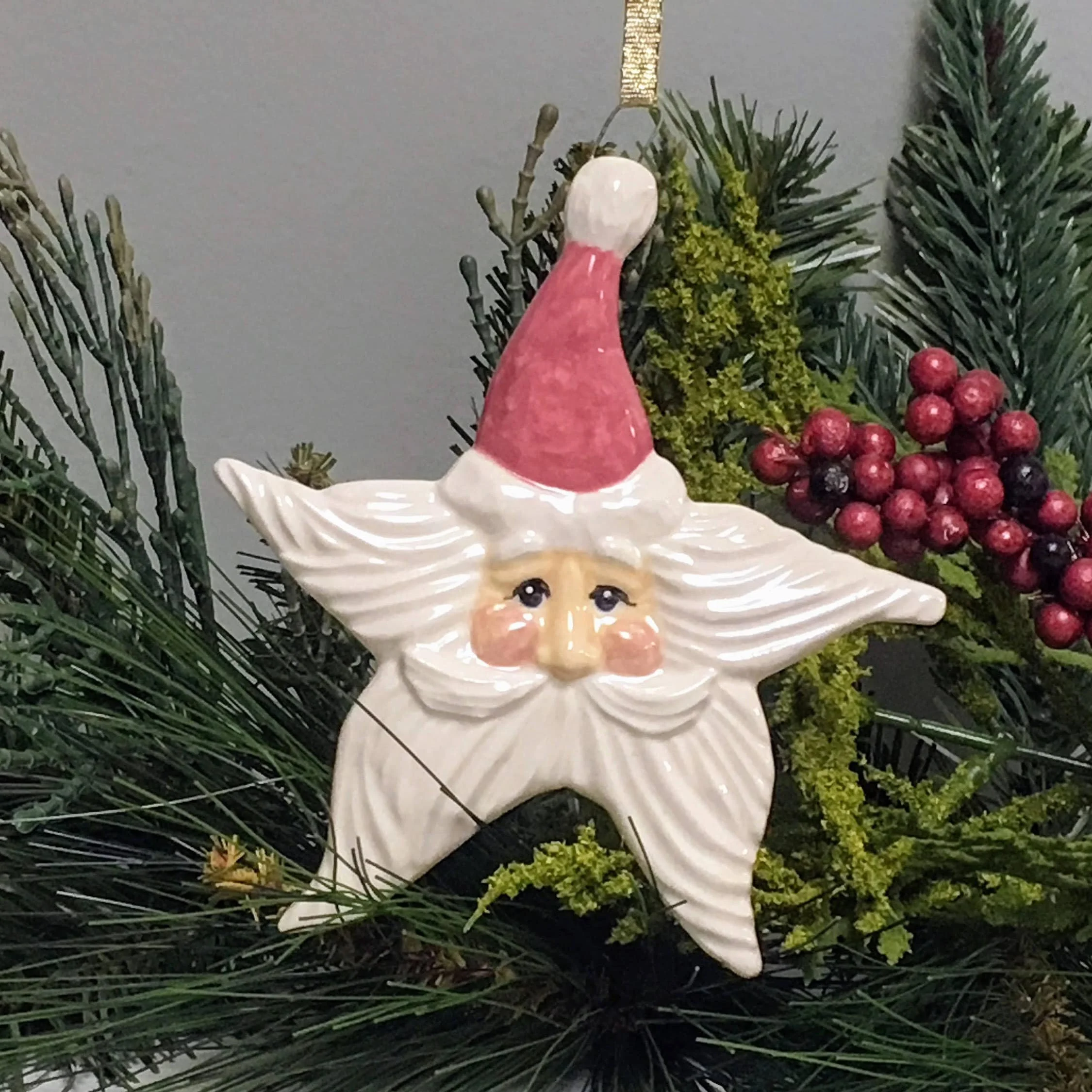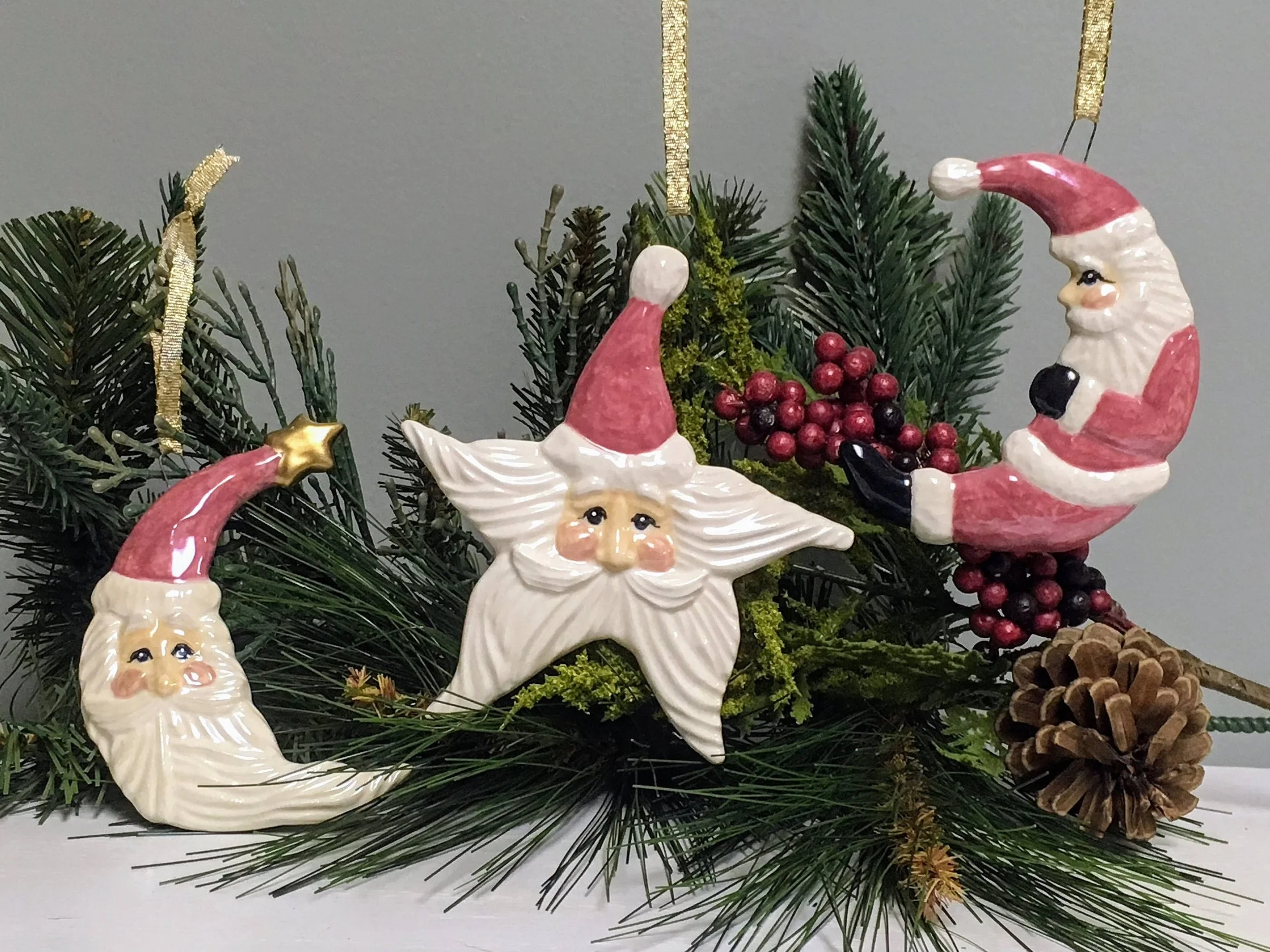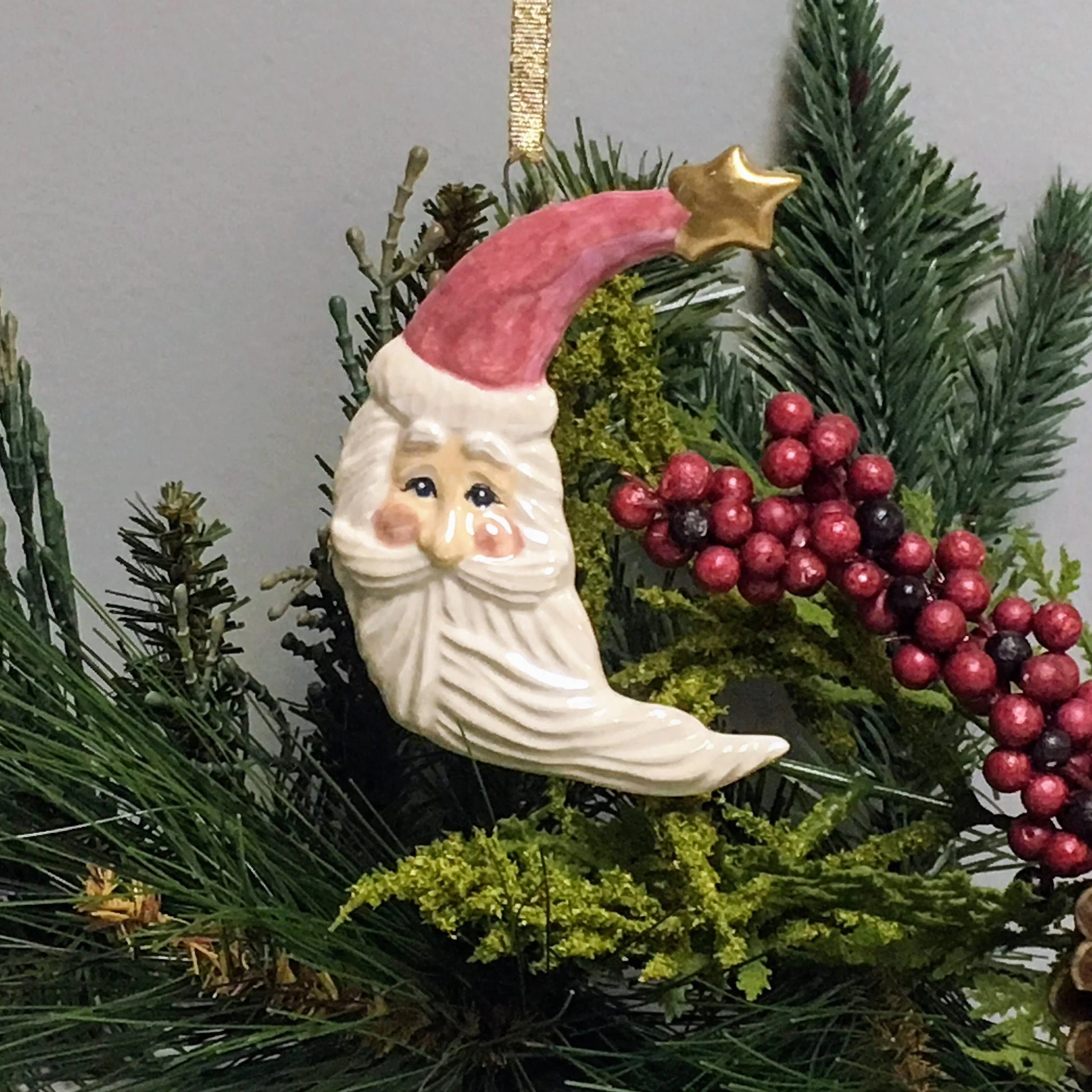 This ornament: • Measures approximately 4 inches tall and 3 inches wide • Has a gold ribbon for hanging that provides a 2-3 inch drop • Is one of three celestial Santa ornaments offered by GrapeVineCeramicsGft.etsy • Finished in underglaze, glaze and mother of pearl