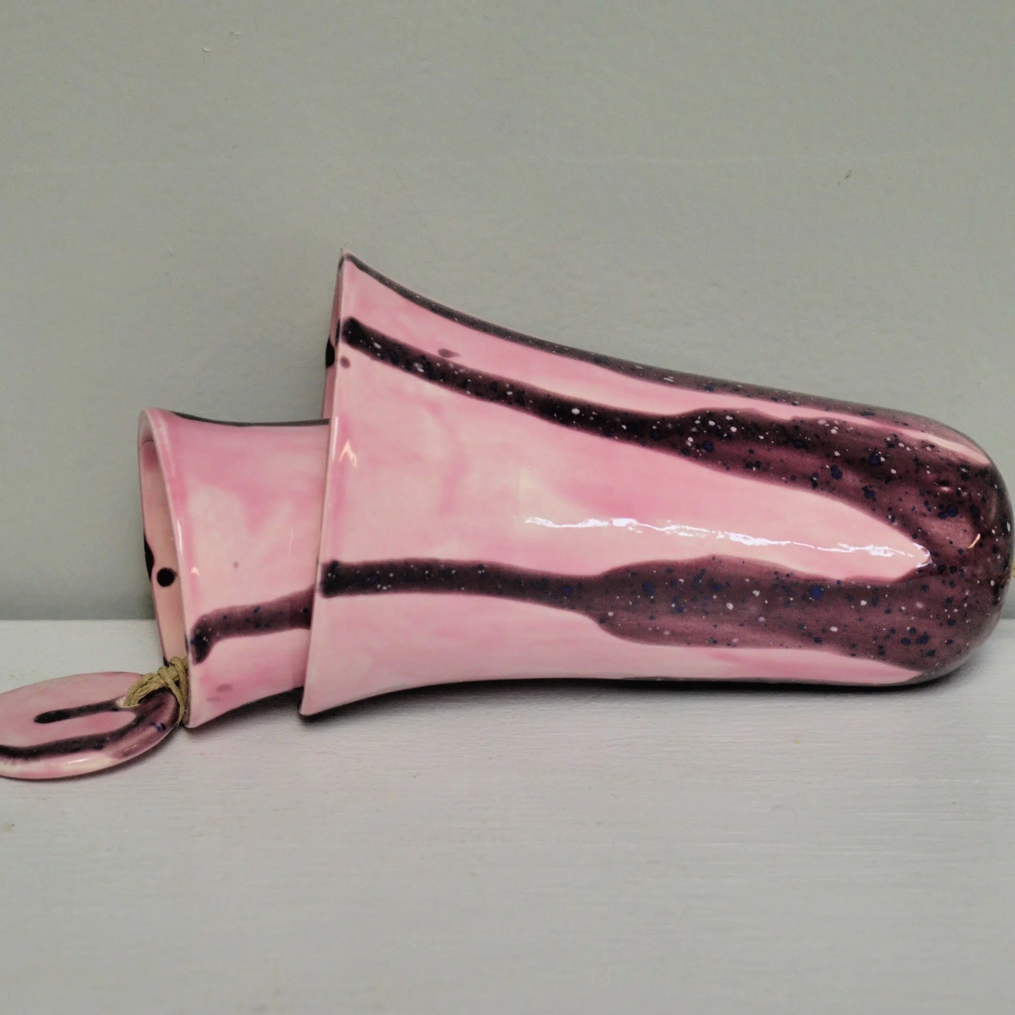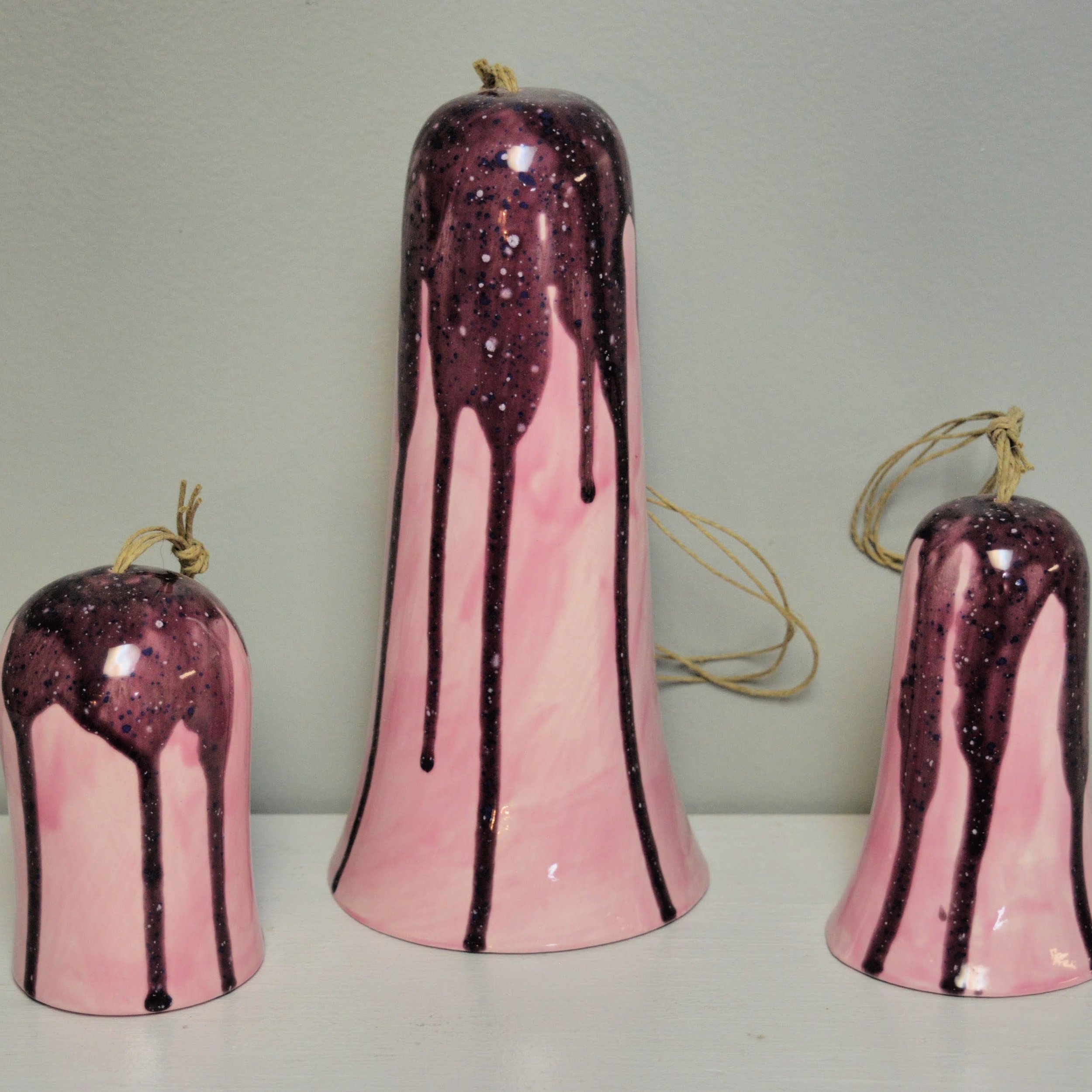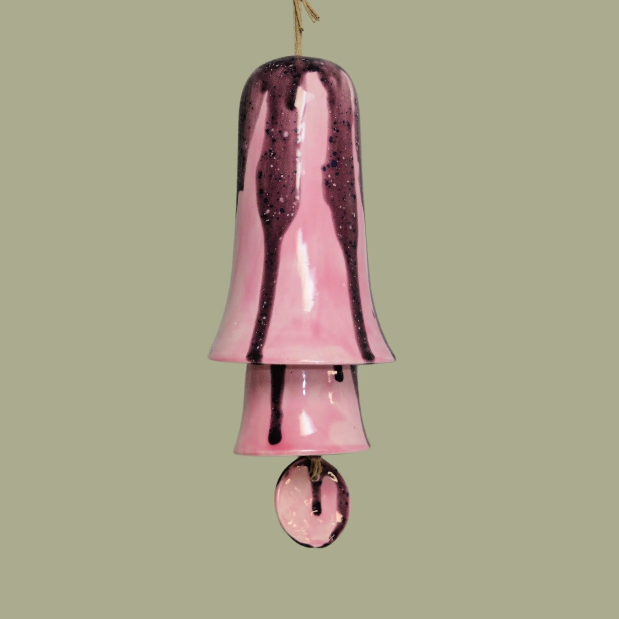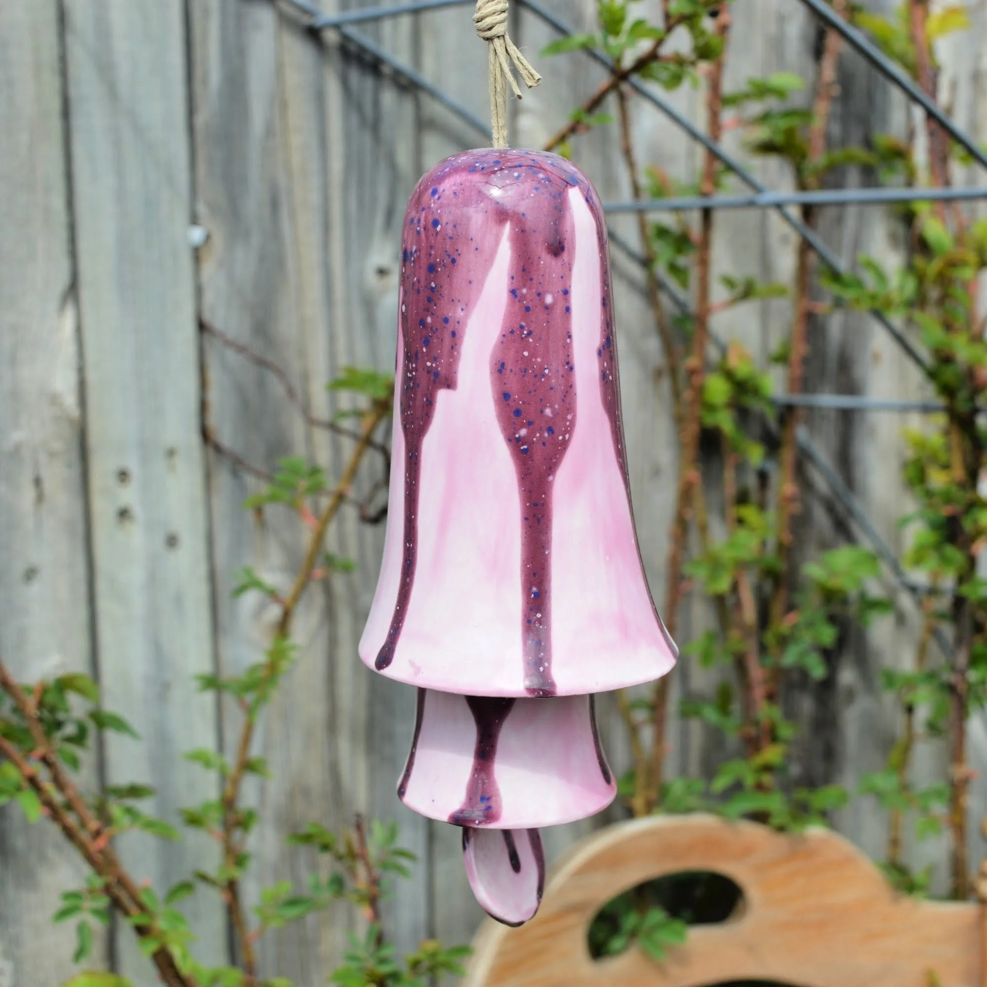 Do you enjoy the sweet tinkle of wind chimes outside your window? This small stack of ceramic wind bells features a pink bell with trails of purple and wine