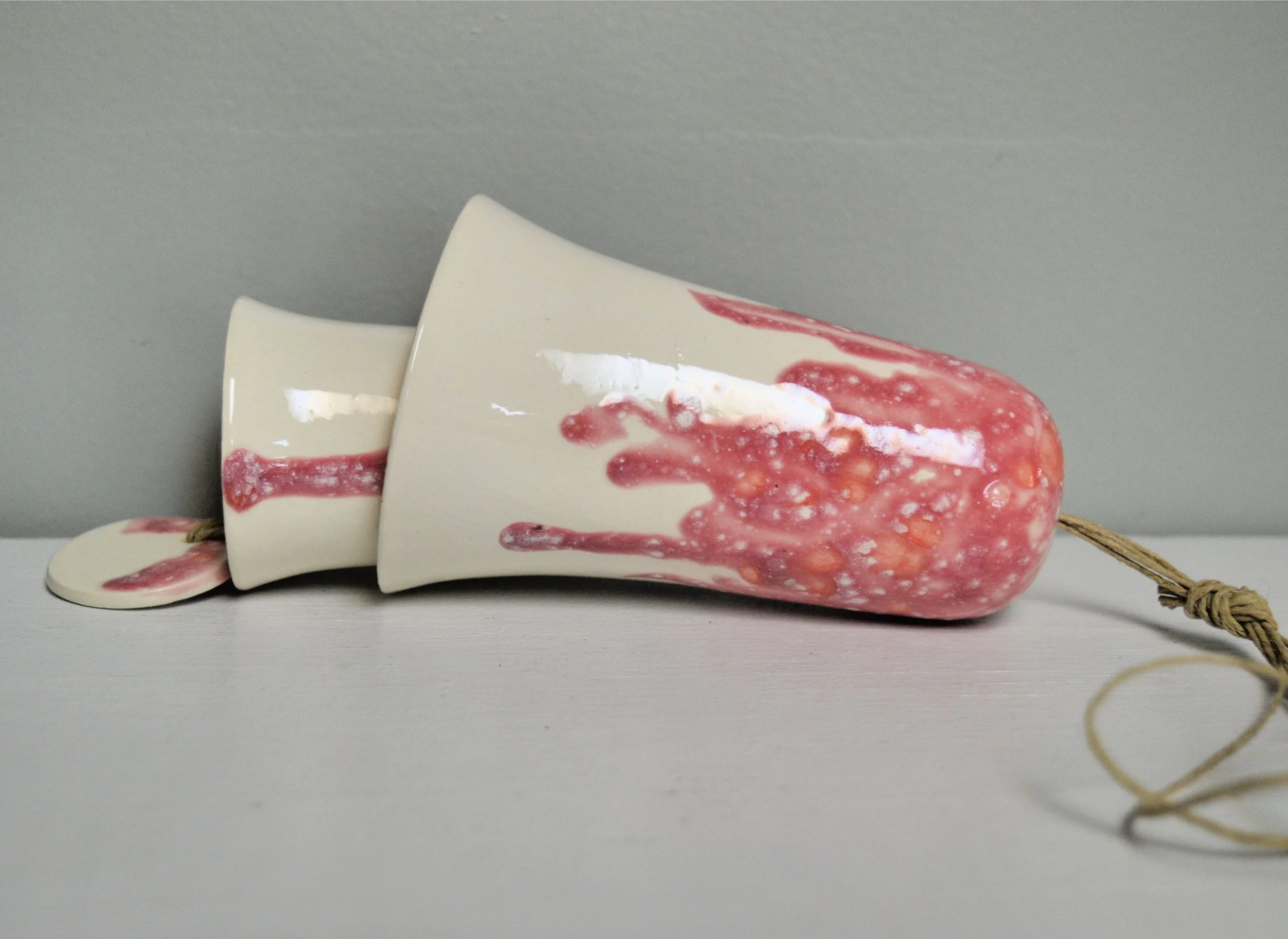 • Each set of cone bells is handmade and hand glazed. Bells may be similar but never exactly the same when purchasing more than one. • The bells hang approximately 13" long including the jute • The largest cone bell is approximately 3.25" in diameter and 4.75” tall • The bells weigh approximately 1 pound. • Bells are suspended on multiple strands of jute • The small stack bells have a higher pitch range than our original conebells. • Tones are never exactly alike from any two sets of bells • Color palette: white, with shades of pink
