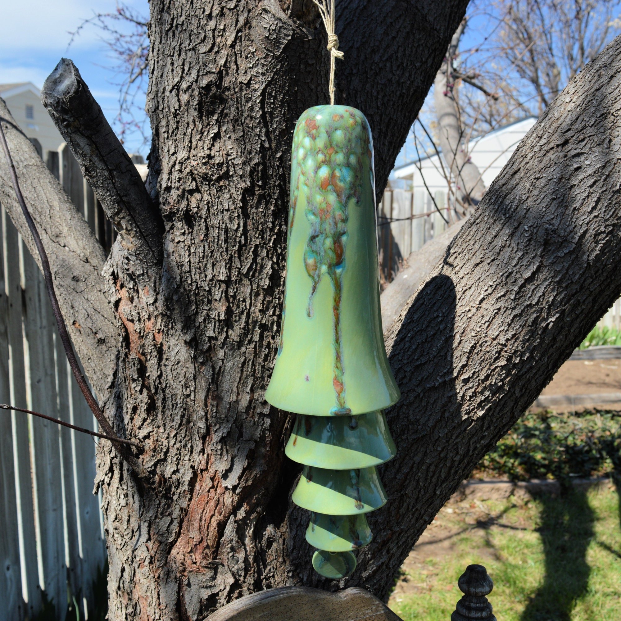 • Each set of cone bells is handmade and hand glazed. Bells may be similar but never exactly the same when purchasing more than one. • The bells hang approximately 20" long • The largest cone bell is approximately 4.5" in diameter and 9.5” tall. • The bells weigh approximately 2 pounds. • Bells are suspended on multiple strands of jute • The tones are never exactly alike from any two sets of bells • Wind chime is Made in the USA with 98% of materials/equipment sourced in the USA • Color palette: sage green, moss green, mocha coffee and sky blue