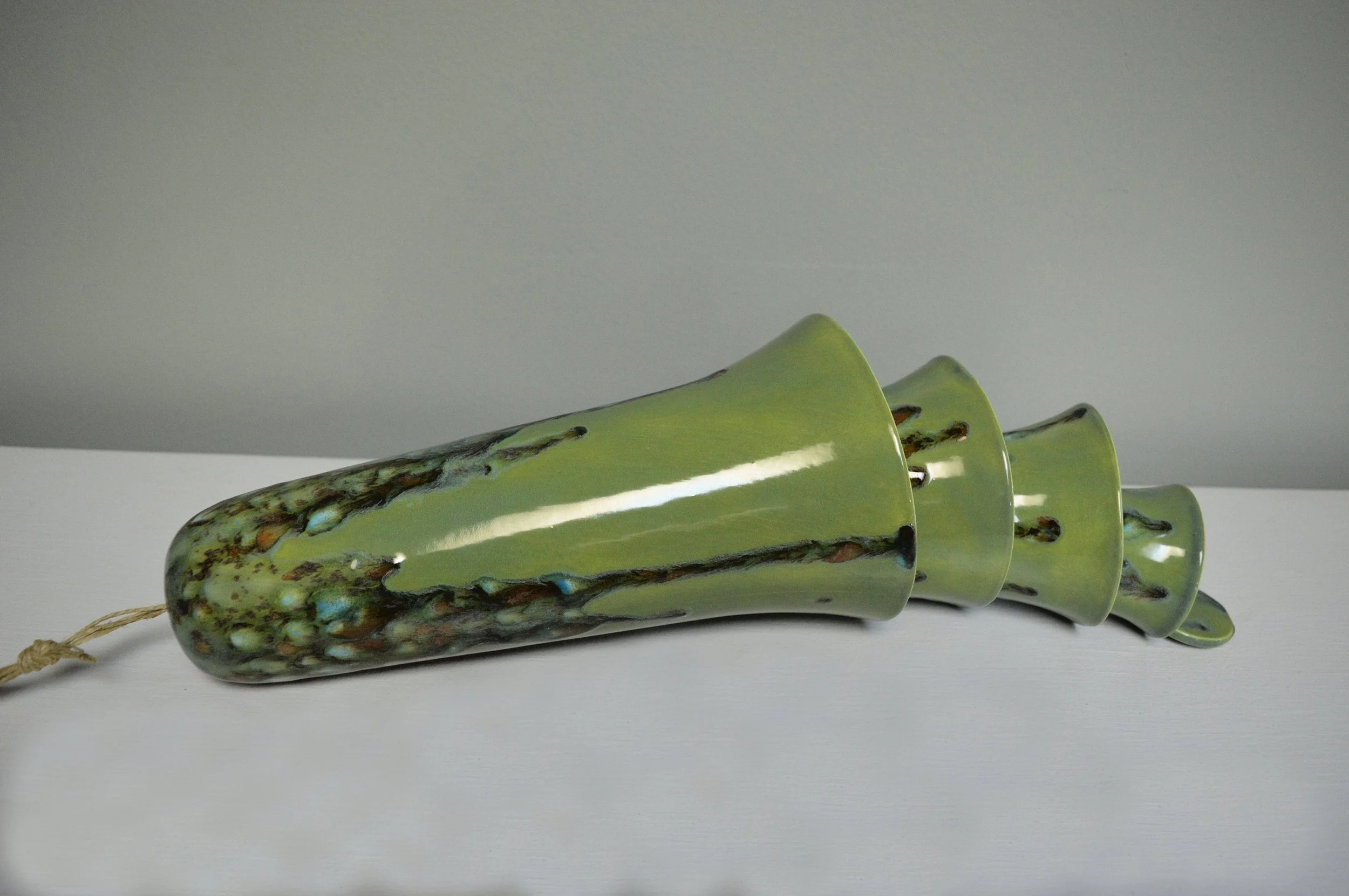 This set of ceramic cone bells combines mossy sage green, shades of mocha coffee and sky blue with pleasant tones to create the perfect wind chime for your outdoor retreat.