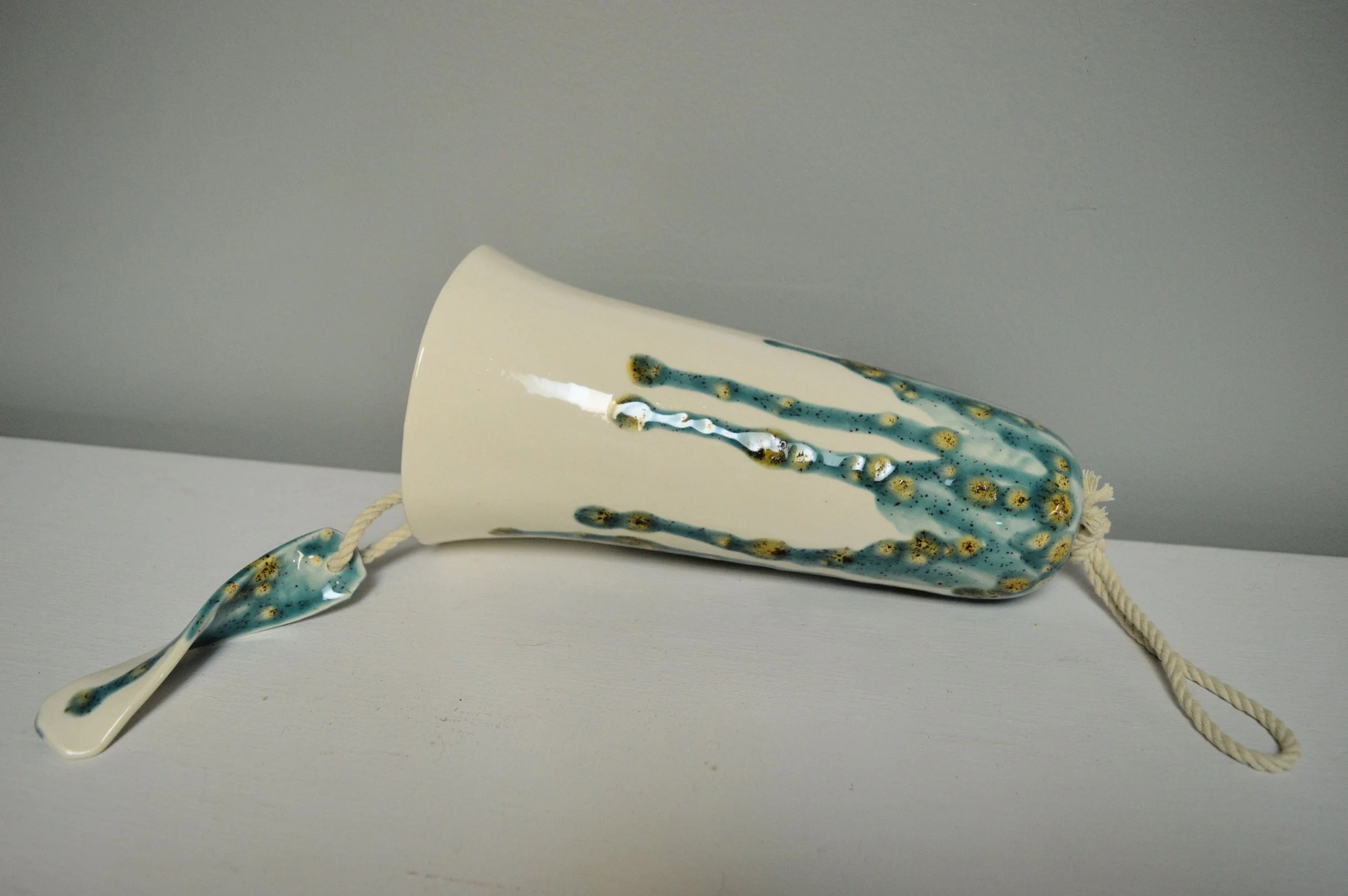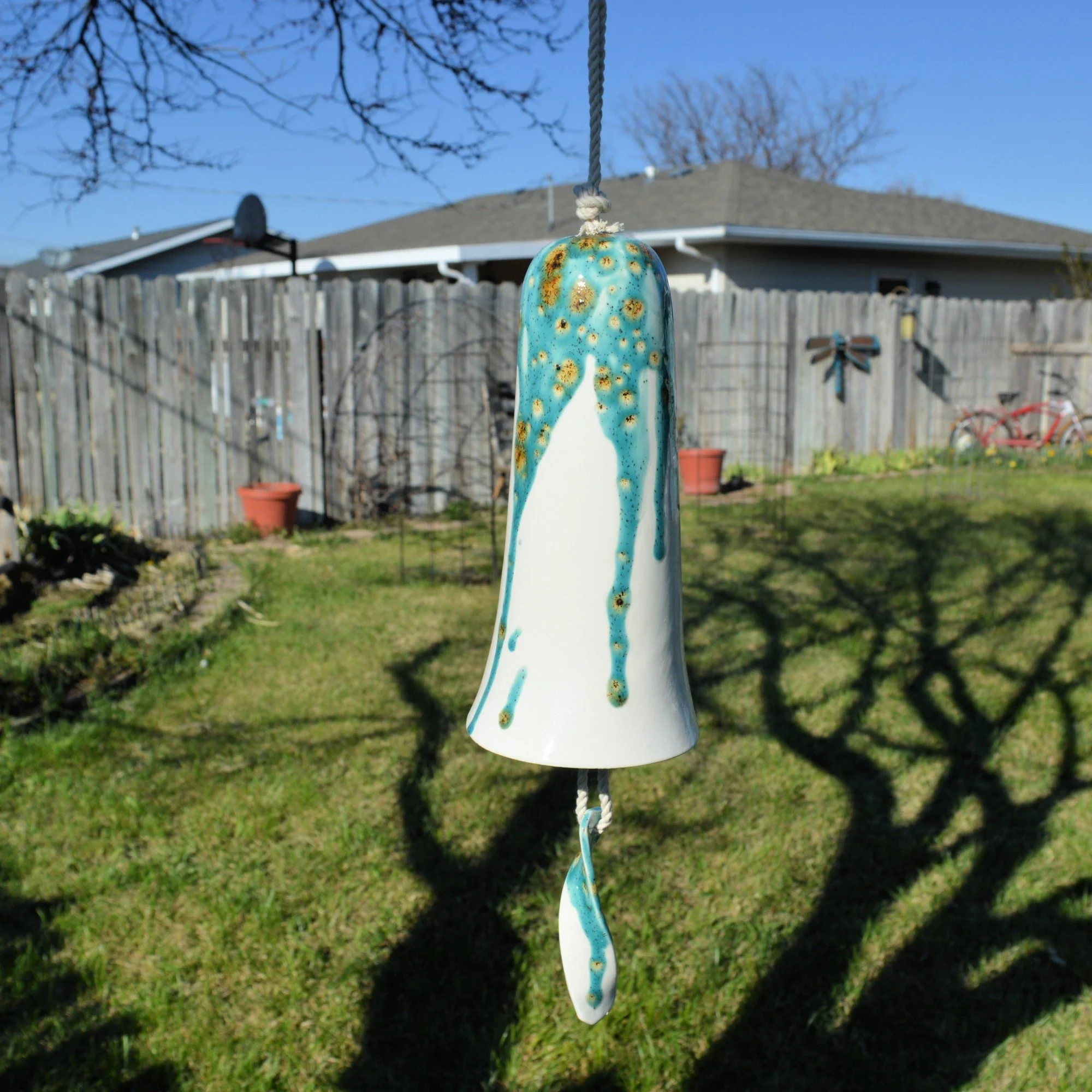 • Each wind bell is handmade and hand glazed. Bells may be similar but never exactly the same when purchasing more than one. • The bell hangs approximately 21" inches long including twine • The bell is approximately 4.5" inches in diameter and 9” inches tall. • The bell weighs approximately 1 pound. • The bell is suspended on cotton cord. • The tones are never exactly alike between from any two wind bells • Wind chime is Made in the USA with 98% of materials/equipment sourced in the USA • Color palette: Teal, Caramel and White