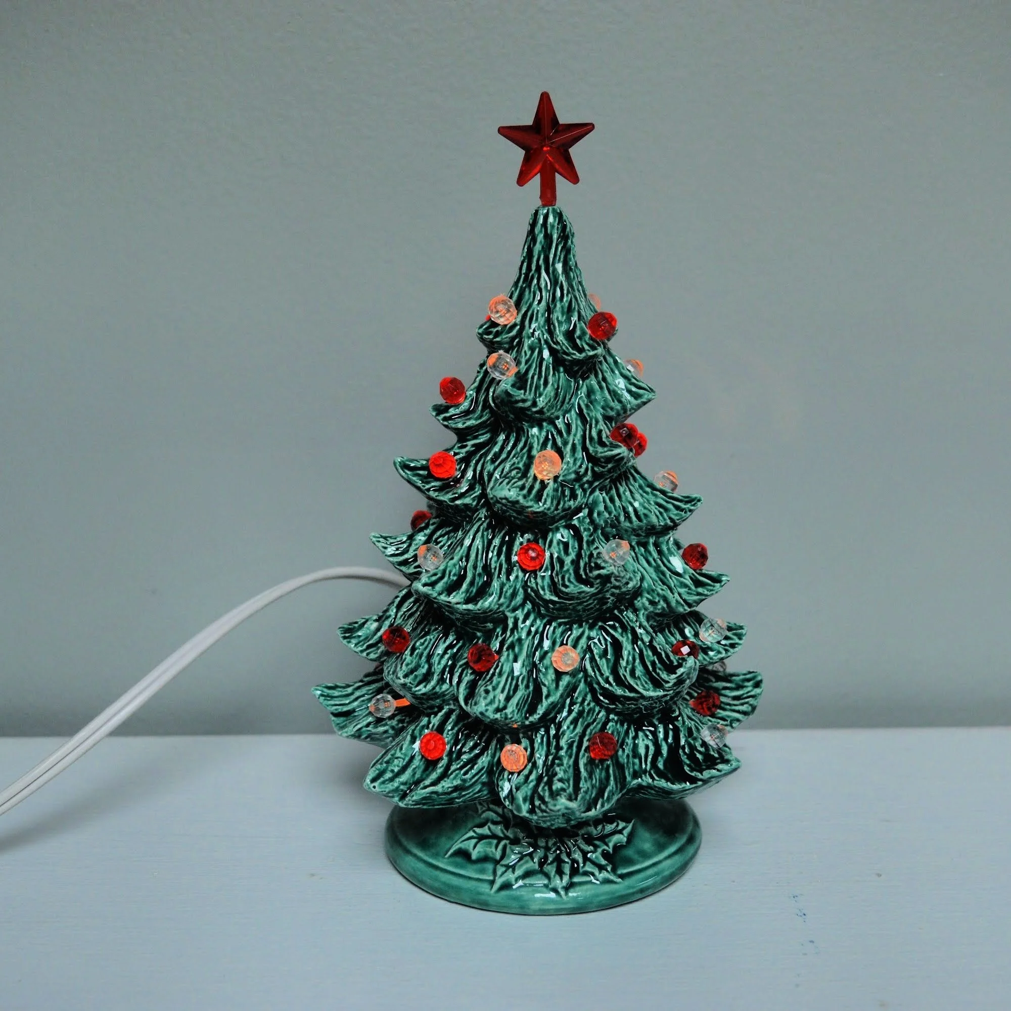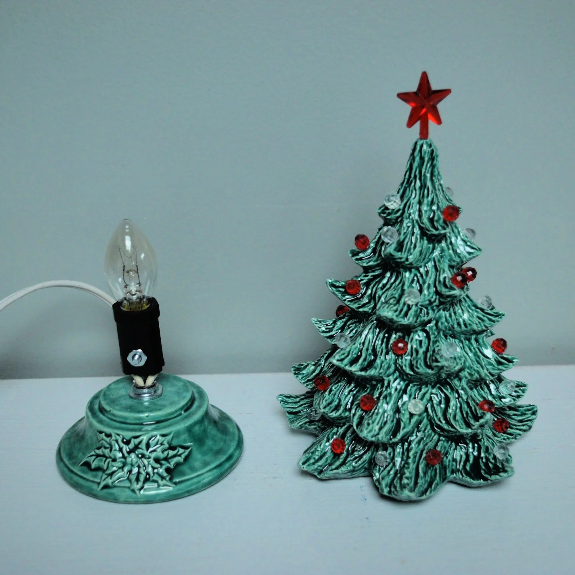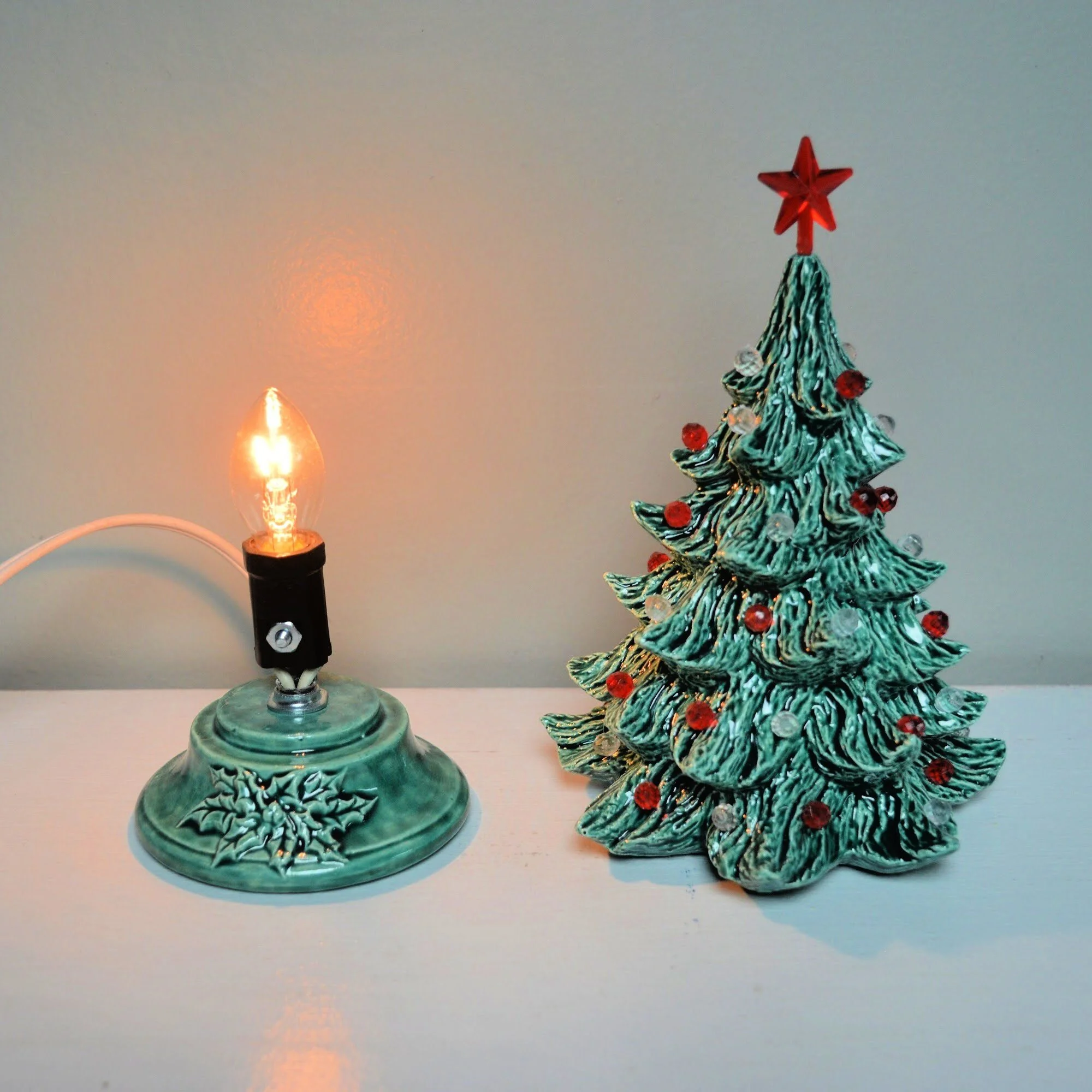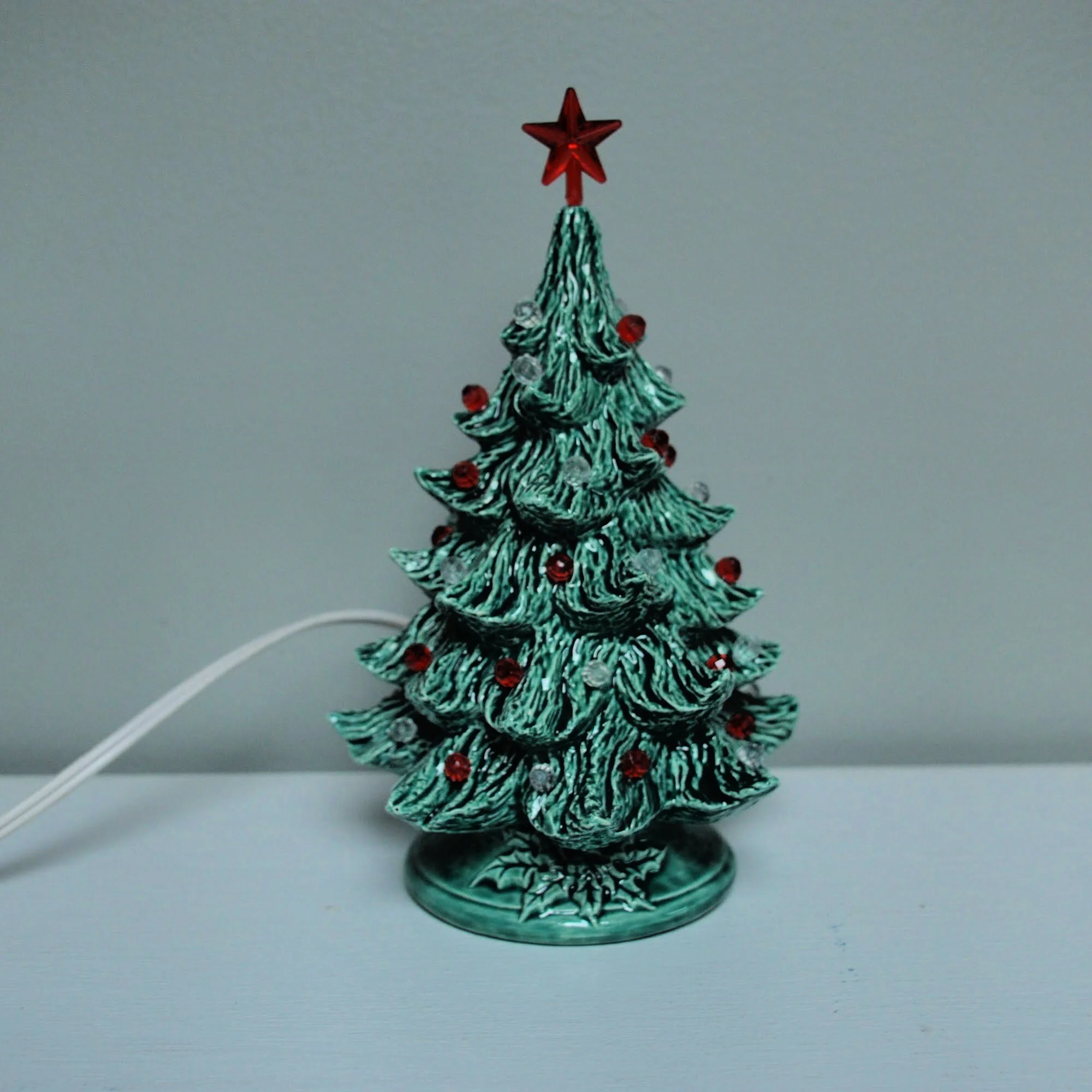 This Ceramic Christmas Tree: • Is 7 inches tall without the star –7.75 inches with the star • Is glazed in a dark green mimicking a natural evergreen • Features Red and White Pin Lights that have been glued in place. • Is fully wired, just screw in the light bulb, place the tree on the base, plug-in and you are ready to enjoy your tree. • Includes a large red modern star • Made in the USA • Will be shipped packaged in bubble wrap and packing peanuts and insured to ensure safe delivery.