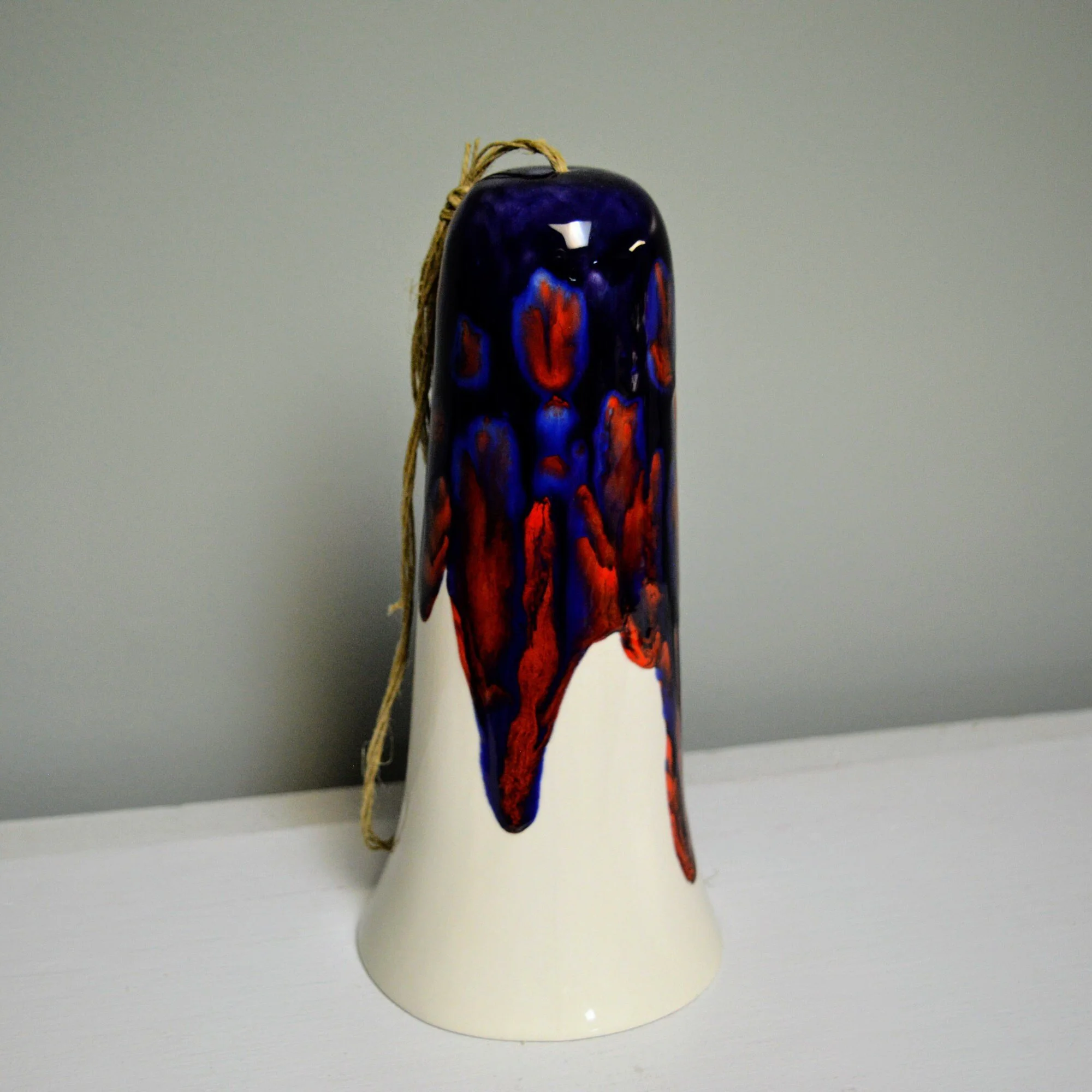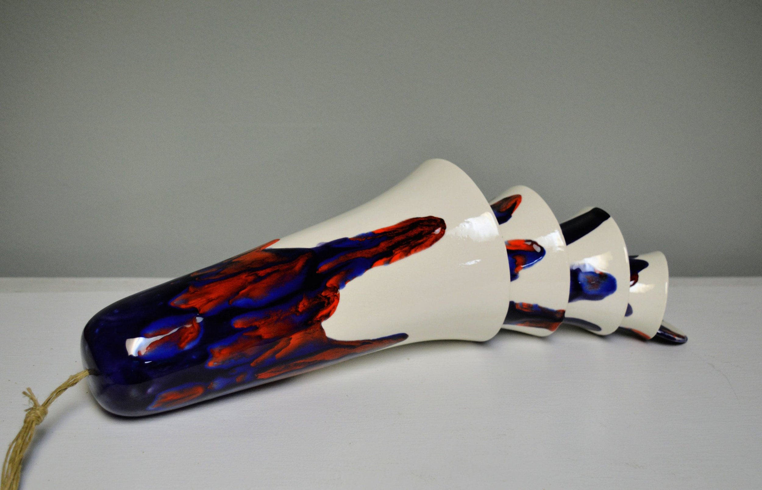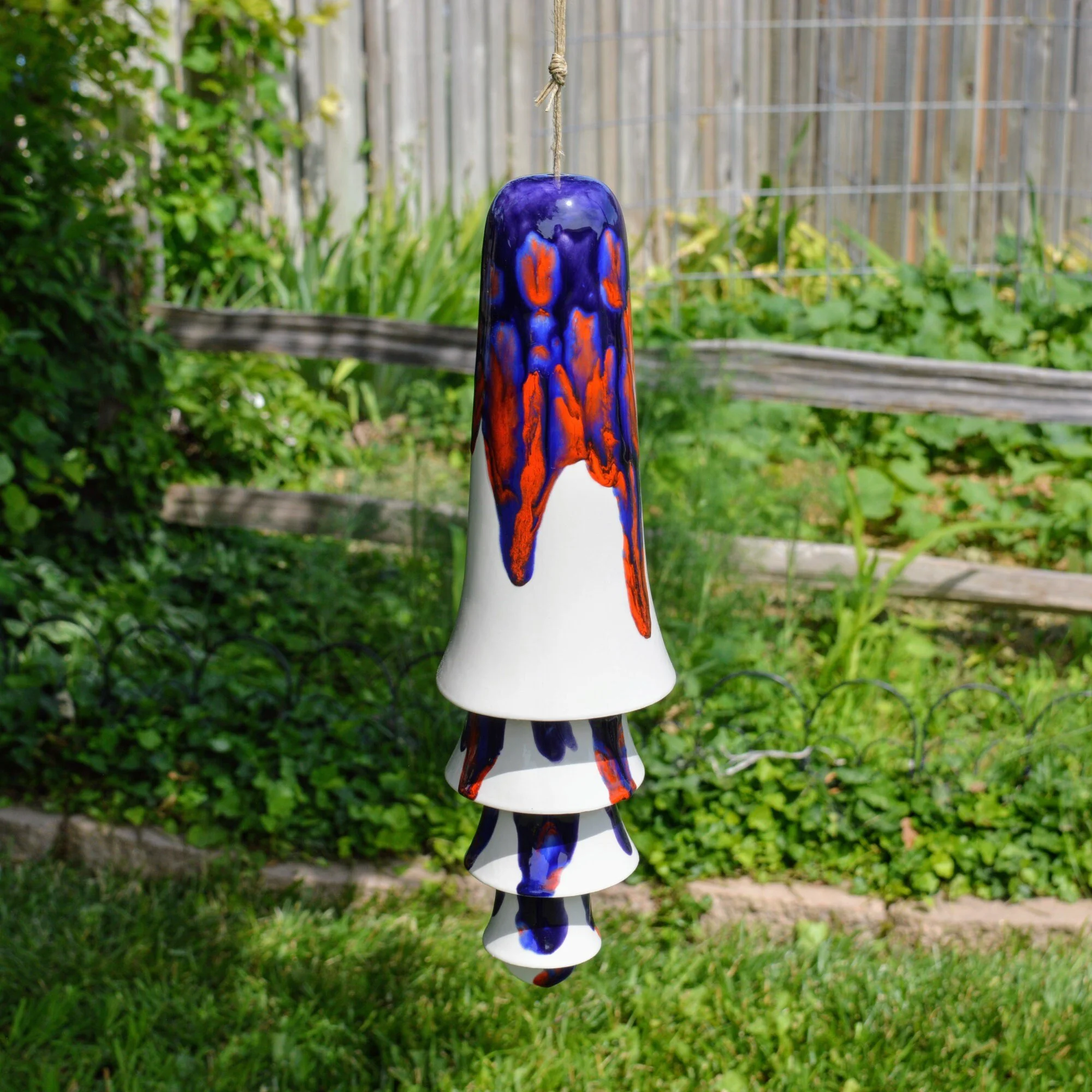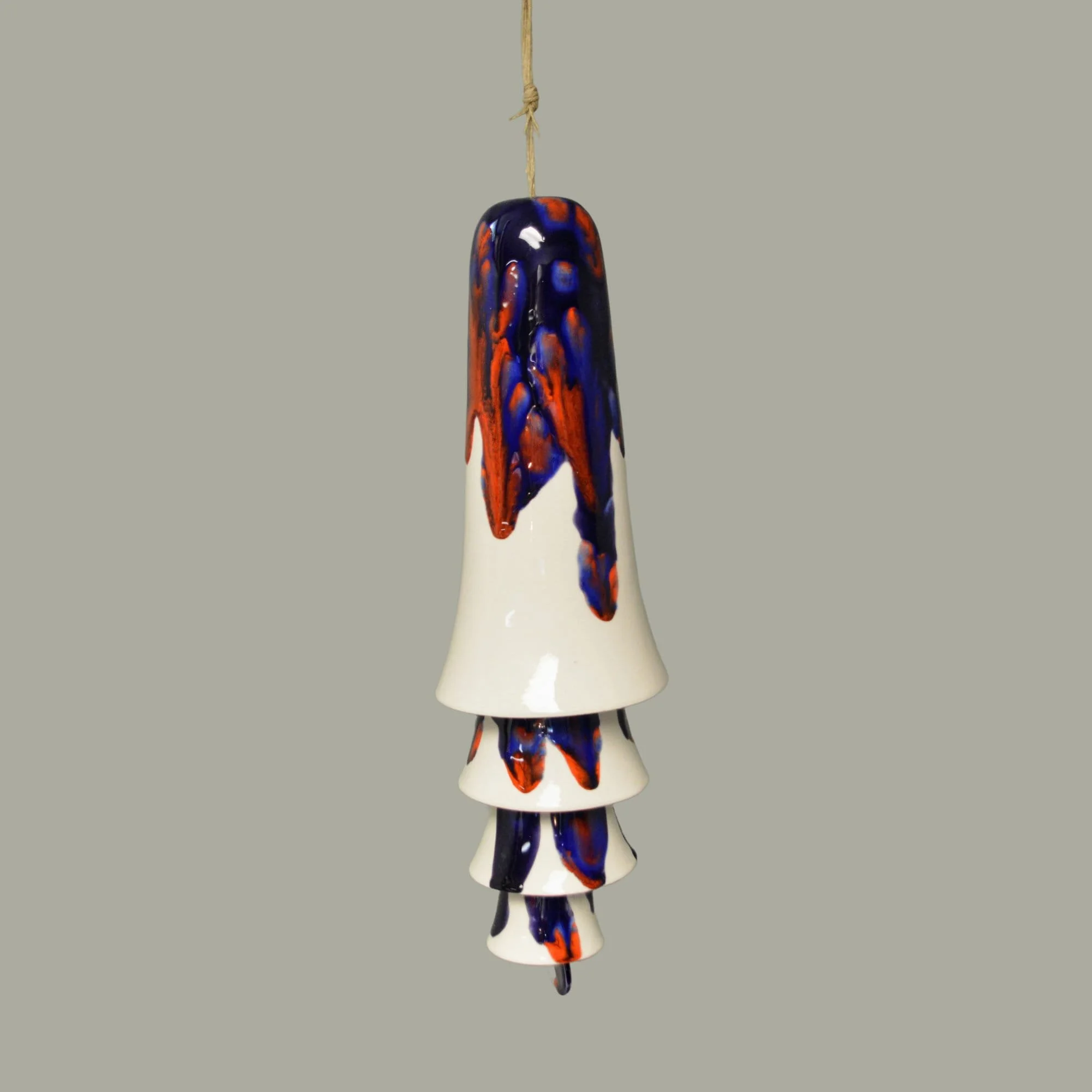 • Each set of cone bells is handmade and hand glazed. Bells may be similar but never exactly the same when purchasing more than one. • The bells hang approximately 20" long • The largest cone bell is approximately 4.5" in diameter and 9.5” tall. • The bells weigh approximately 2 pounds. • Bells are suspended on multiple strands of jute • The tones are never exactly alike from any two sets of bells • Wind chime is Made in the USA with 98% of materials/equipment sourced in the USA • Color palette: white, bright red, deep blue, blue violet