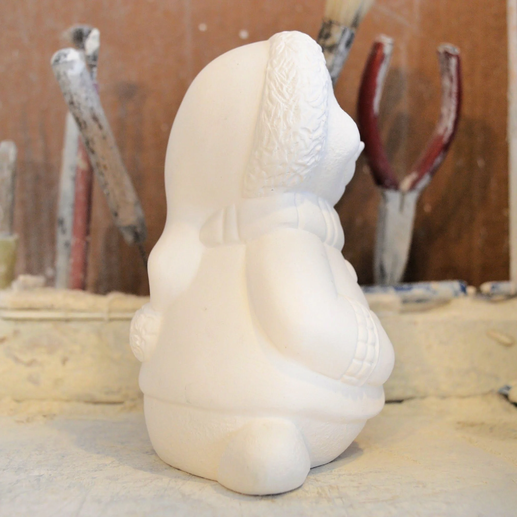 Our bisque is poured using earthenware ceramic liquid slip. Seams are then professionally cleaned, and imperfections are removed/repaired by hand. All pieces are ready for your personal touch using the medium of your choice. Recommended finishes for Cone 04 bisque: acrylic paints, artist chalk, oil paint sticks, or low-fire underglaze/glaze – the choice is yours, let your creativity flow. If you are creating items for food or liquid, please follow the directions provided by your glaze manufacturer to ensure food safe precautions. Please be aware that when using clear glaze, your piece will fire to a cream or ivory tone due to the talc content in our slip formulation. Currently, no adjustments appear necessary for pigmented glazes.