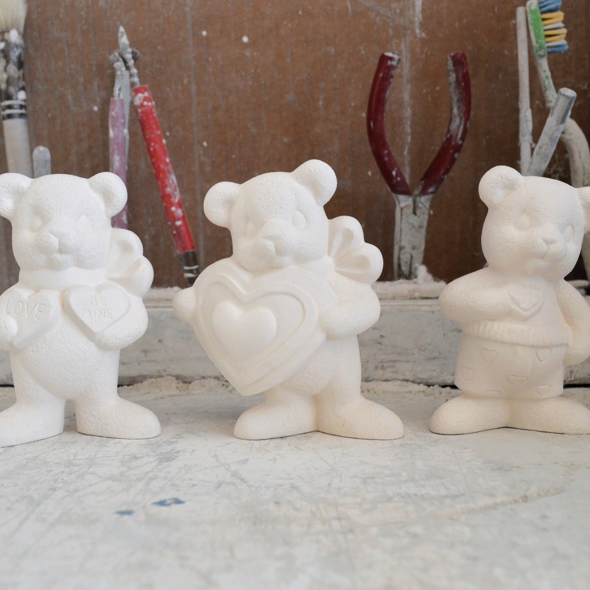 Our bisque is poured using earthenware ceramic liquid slip. Seams are then professionally cleaned, and imperfections are removed/repaired by hand. All pieces are ready for your personal touch using the medium of your choice. Recommended finishes for Cone 04 bisque: acrylic paints, artist chalk, oil paint sticks, or low-fire underglaze/glaze – the choice is yours, let your creativity flow. If you are creating items for food or liquid, please follow the directions provided by your glaze manufacturer to ensure food safe precautions. Please be aware that when using clear glaze, your piece will fire to a cream or ivory tone due to the talc content in our slip formulation. Currently, no adjustments appear necessary for pigmented glazes.