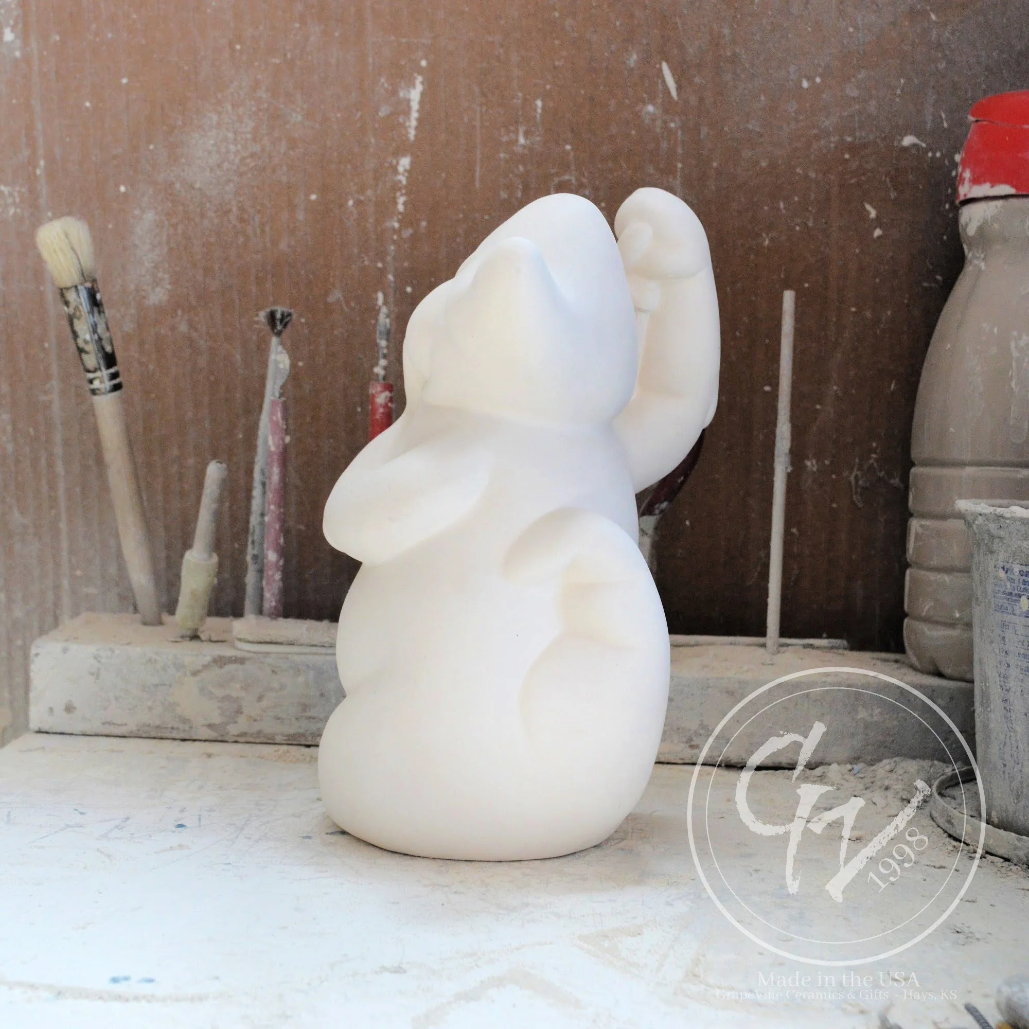 Our bisque is poured using earthenware ceramic liquid slip. Seams are then professionally cleaned, and imperfections are removed/repaired by hand. All pieces are ready for your personal touch using the medium of your choice. Recommended finishes for Cone 04 bisque: acrylic paints, artist chalk, oil paint sticks, or low-fire underglaze/glaze – the choice is yours, let your creativity flow. If you are creating items for food or liquid, please follow the directions provided by your glaze manufacturer to ensure food safe precautions. Please be aware that when using clear glaze, your piece will fire to a cream or ivory tone due to the talc content in our slip formulation. Currently, no adjustments appear necessary for pigmented glazes.
