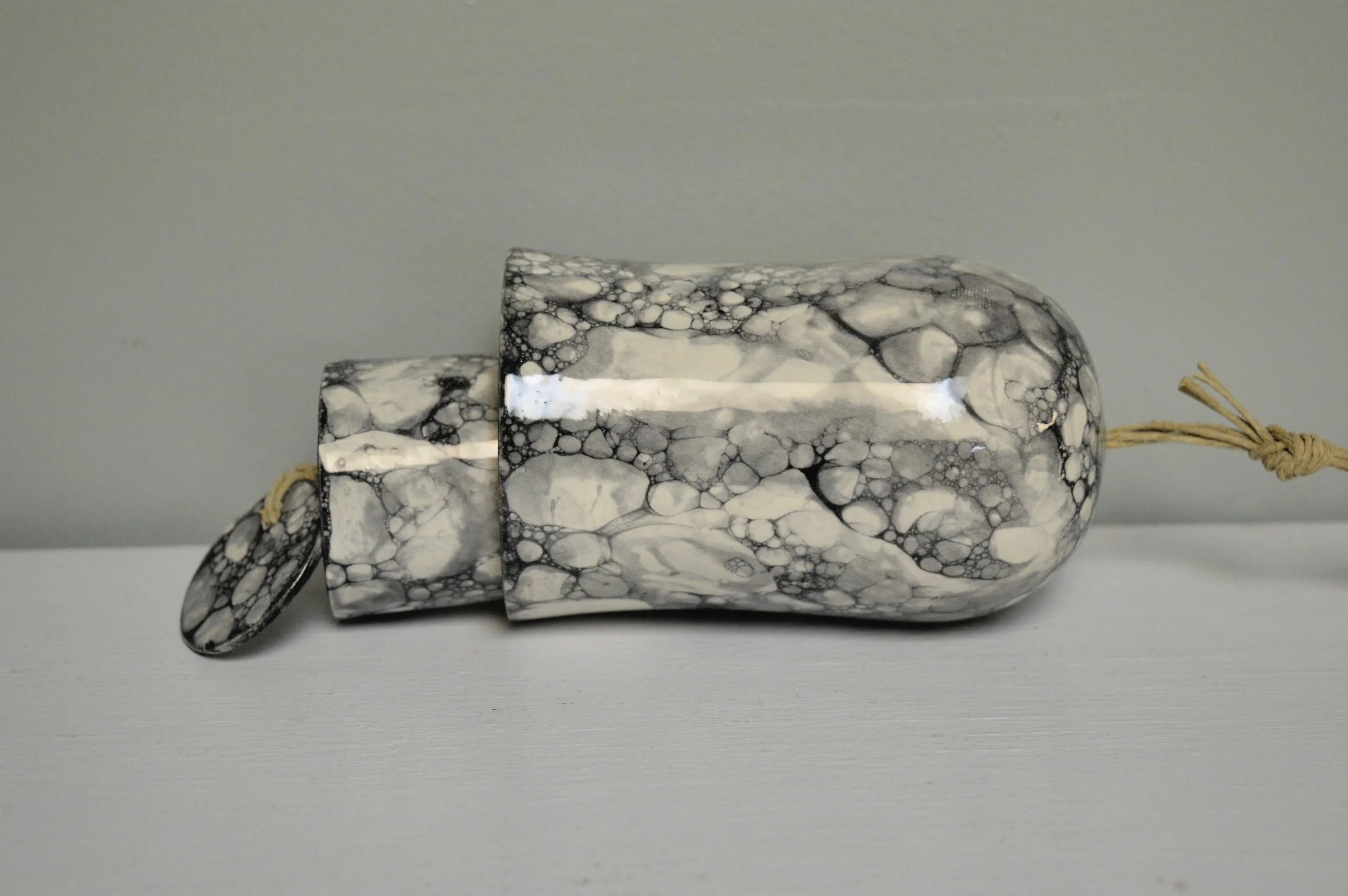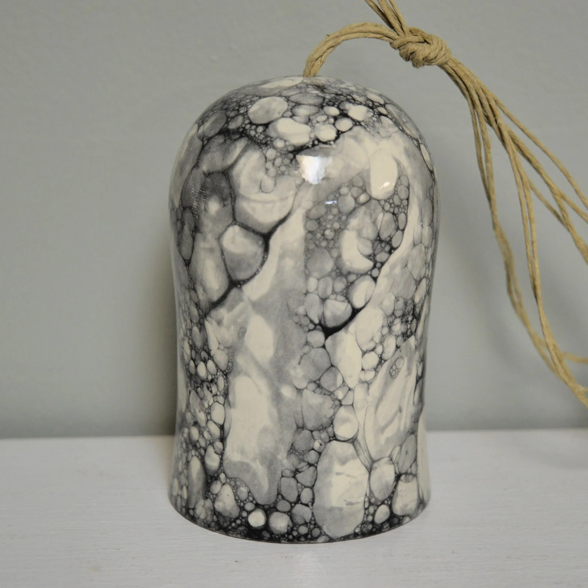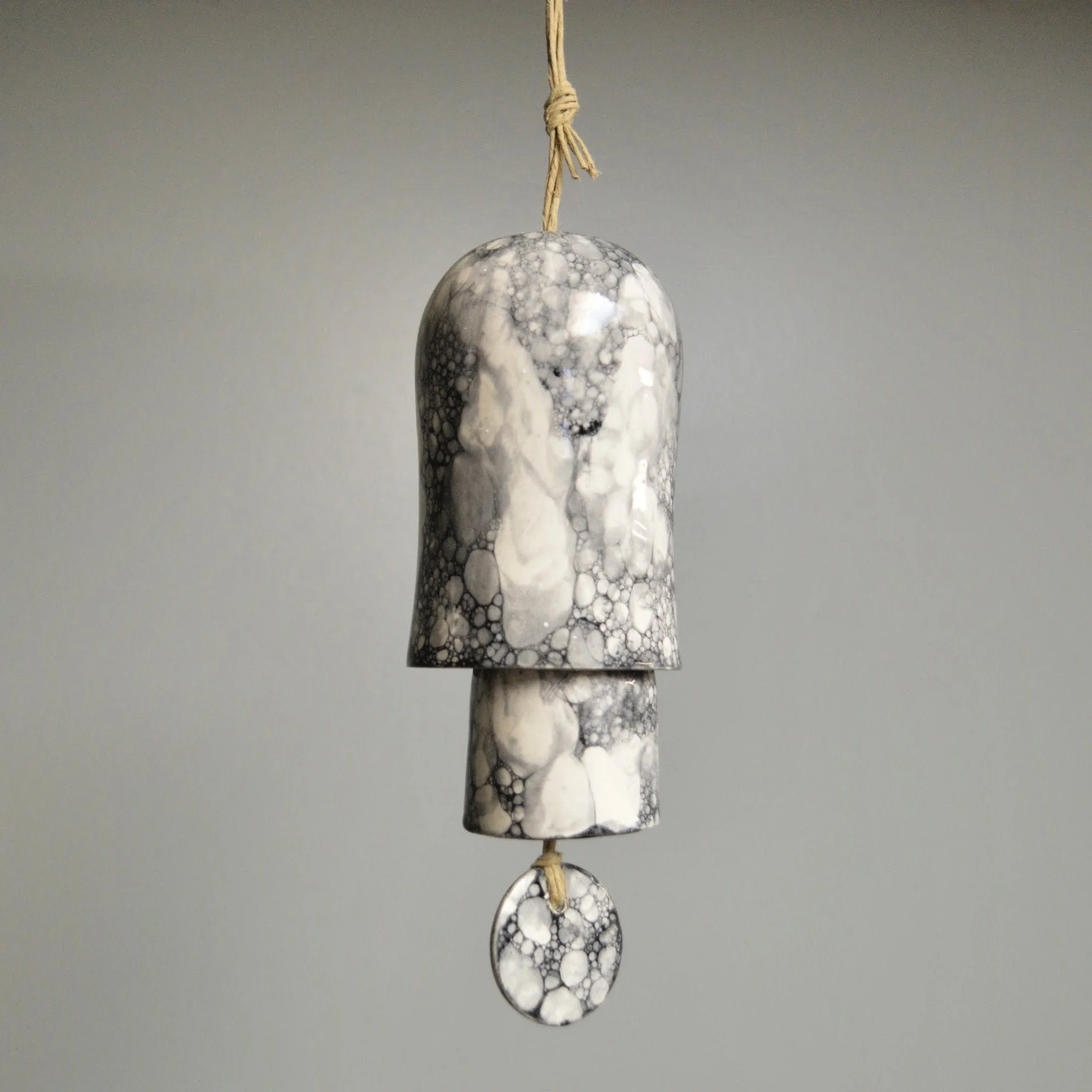 This small stack of ceramic wind bells features a striking black and white bubble glaze finish.