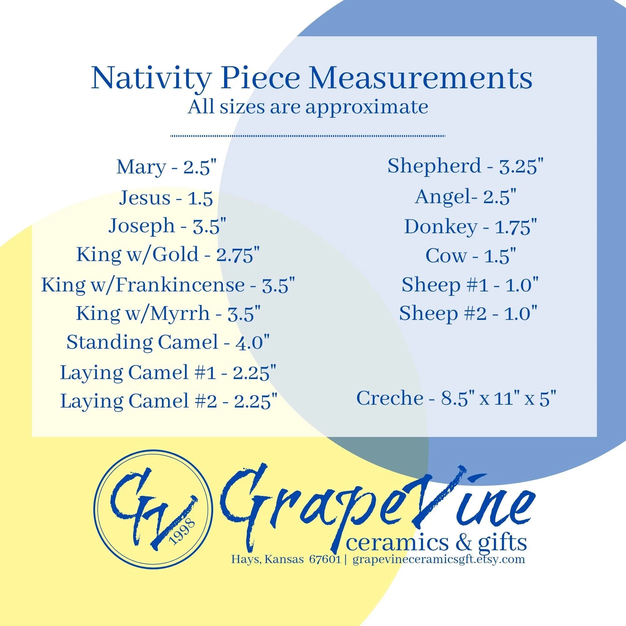 Each Nativity: • Consists of 16 pieces o Jesus, Mary & Joseph o Three Kings o One Shepherd o Angel o Three Camels o Donkey & Cow o Two Sheep o Creche • Mother of Pearl finish is READY TO SHIP • Nativity is Made in the USA with 98% of materials/equipment sourced in the USA • Creche measures approximately 3.5” tall and 4.5” long - Largest Camel is 4" tall and 4.75"long